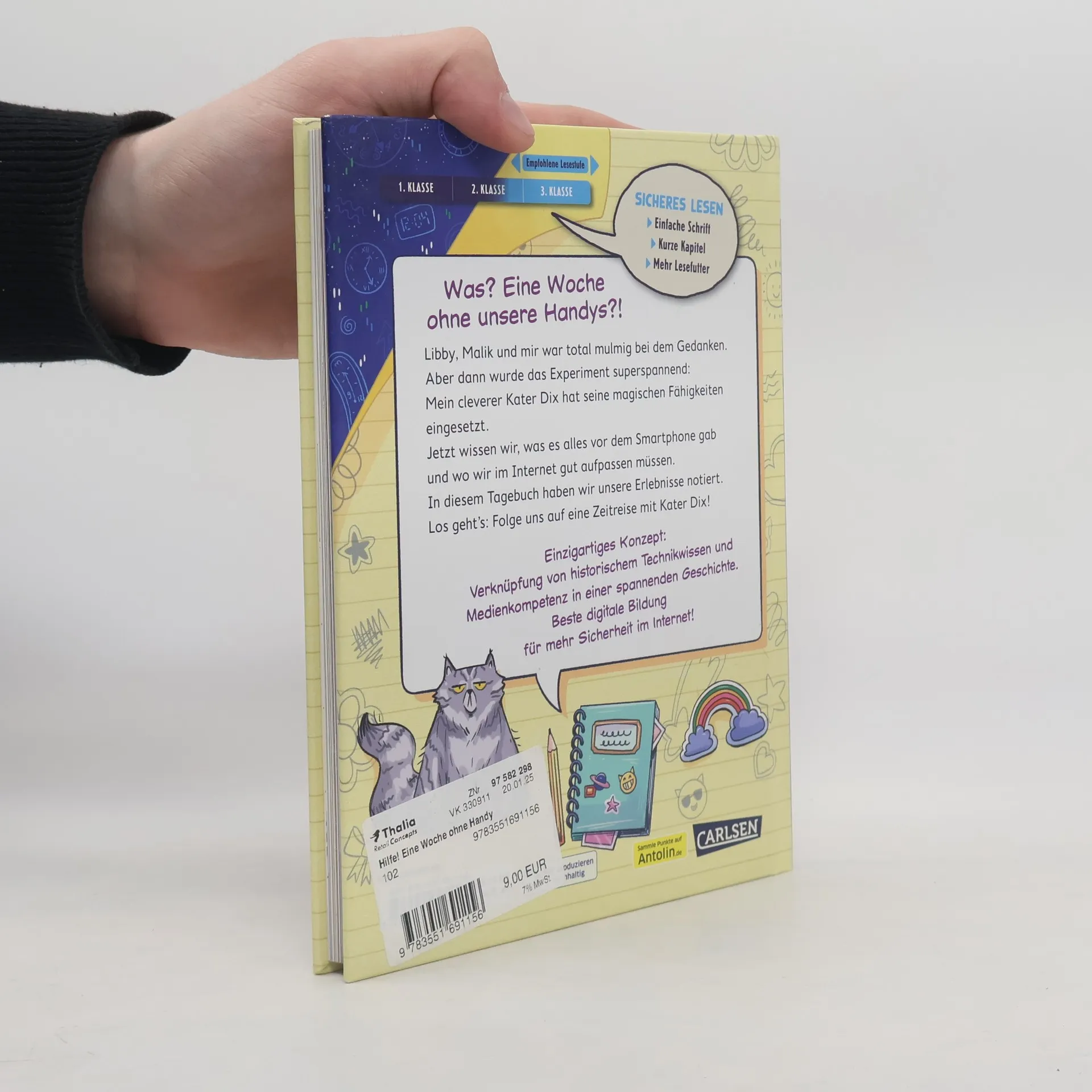In dieser spannenden Geschichte erleben Rosa, Libby und Malik eine Woche ohne Handys, unterstützt von Rosas sprechendem Kater Dix, der sie auf eine Zeitreise in die Vergangenheit mitnimmt. Das Buch vermittelt Medienkompetenz und historische Bezüge zu Smartphones, ergänzt durch ein Wörterbuch wichtiger Fachbegriffe. Ideal für Erstlesende.