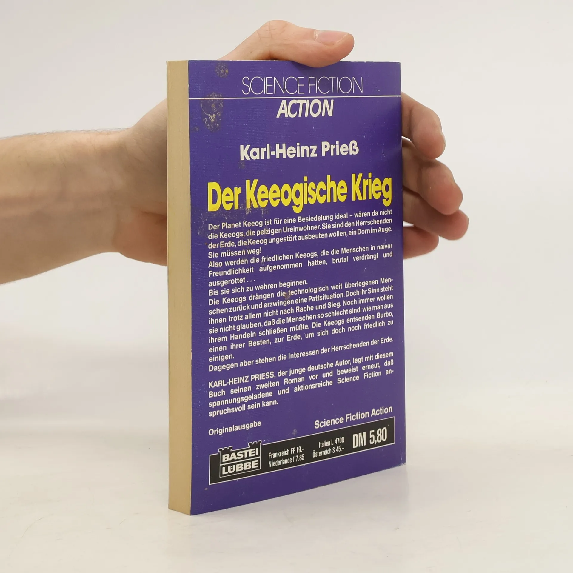 Karl-Heinz PrießDer Keeogische Krieg:Der Planet Keeog ist für eine Besiedelung ideal - wären da nicht die Keeogs, die pelzigen Ureinwohner. Sie sind den Herrschenden der Erde, die Keeog ungestört ausbeuten wollen, ein Dorn im Auge. Sie müssen weg!Also werden die friedlichen Keeogs, die die Menschen in naiver Freundlichkeit aufgenommen hatten, brutal verdrängt und ausgerottet...Bis sie sich zu wehren beginnen.Die Keeogs drängen die technologisch weit überlegenen Menschen zurück und erzwingen eine Pattsituation. Doch ihr Sinn steht ihnen trotz allem nicht nach Rache und Sieg. Noch immer wollen sie nicht glauben, daß die Menschen so schlecht sind, wie man aus ihrem Handeln schließen müßte. Die Keeogs entsenden Burbo, einen ihrer Besten, zur Erde, um sich doch noch friedlich zu einigen.Dagegen aber stehen die Interessen der Herrschenden der Erde.KARL-HEINZ PRIESS, der junge deutsche Autor, legt mit diesem Buch seinen zweiten Roman vor und beweist erneut, daß spannungsgeladene und aktionsreiche Science Fiction anspruchsvoll sein kann.Originalausgabe