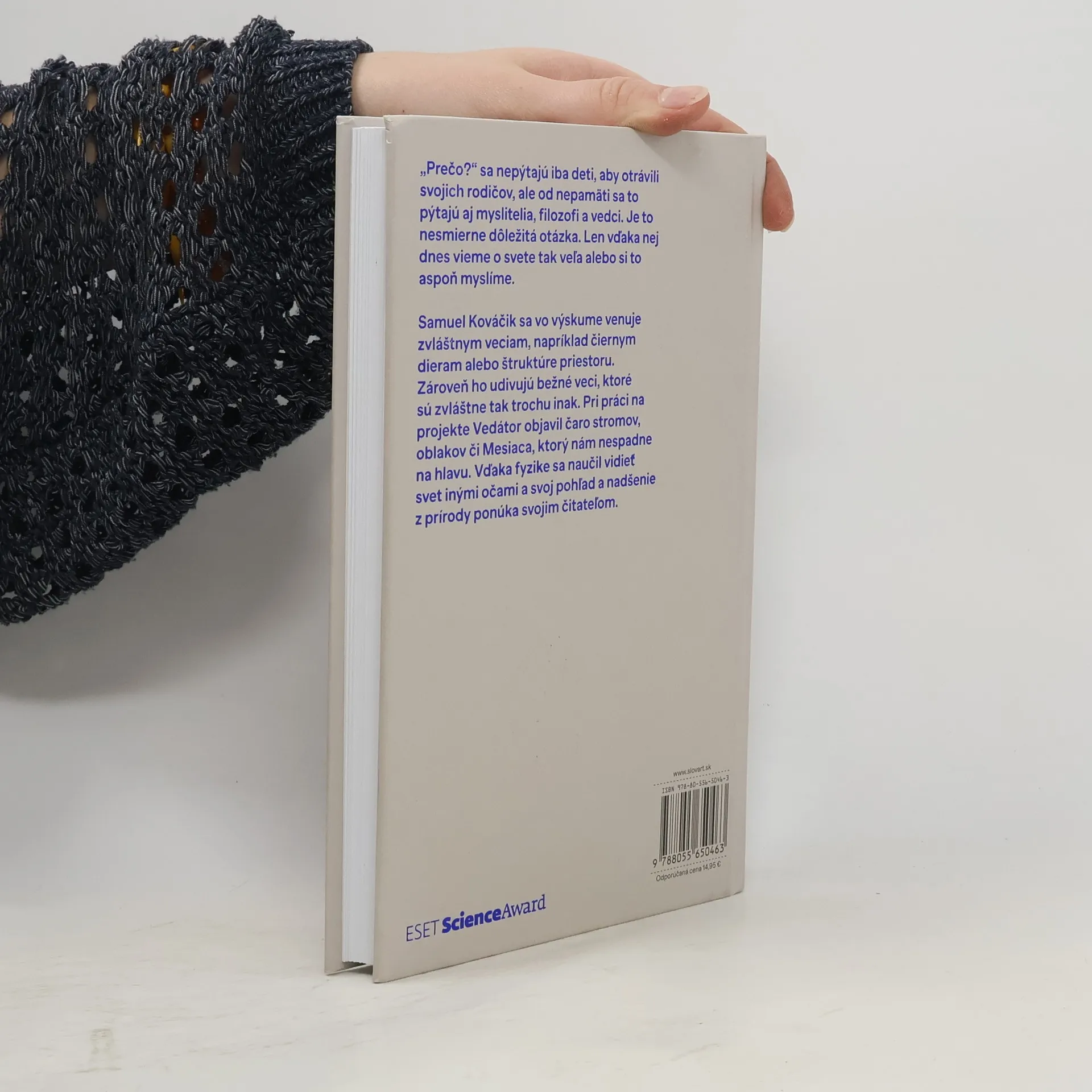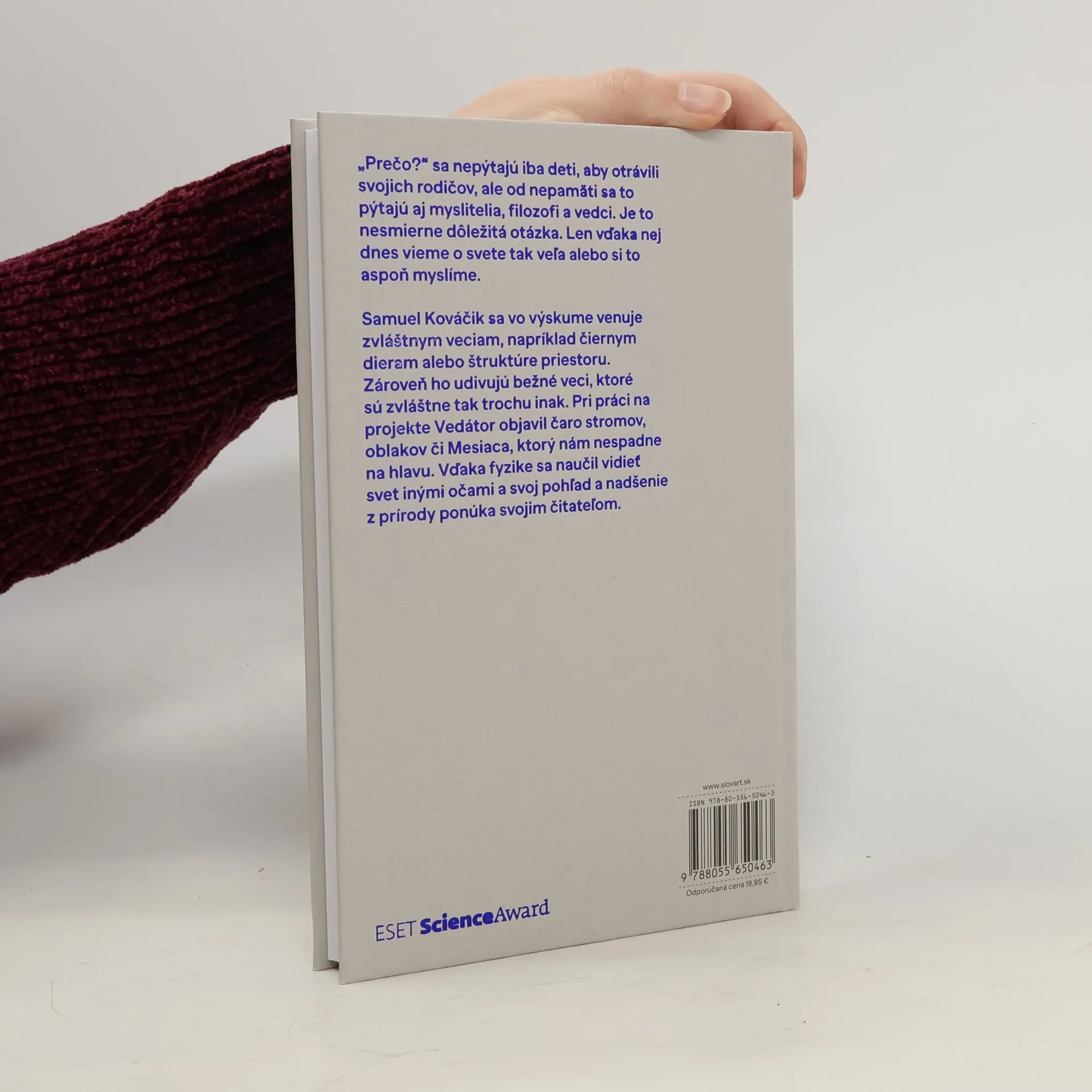Prečo? sa nepýtajú iba deti, aby dokonale otrávili svojich rodičov, ale od nepamäti sa to pýtajú aj myslitelia, filozofi a vedci. Je to nesmierne dôležitá otázka, a len vďaka nej dnes vieme o svete pomerne veľa, alebo si to aspoň myslíme. Samuel Kováčik, fyzik, ktorý stojí za projektom Vedátor.sk, rozpráva o vede fascinujúcim spôsobom. A to bez jediného vzorca či rovnice. Vysvetľuje bežné veci okolo nás - prečo je rastlina zelená, prečo Mesiac nespadne, ako vzniká dúha, odkiaľ sa berú oblaky či snehové vločky, prečo máme ročné obdobia. Pre niekoho to môže byť nuda, no pre Samuela sú to obyčajné zázraky a pre rodičov to môžu byť odpovede na detskú otázku - Prečo?