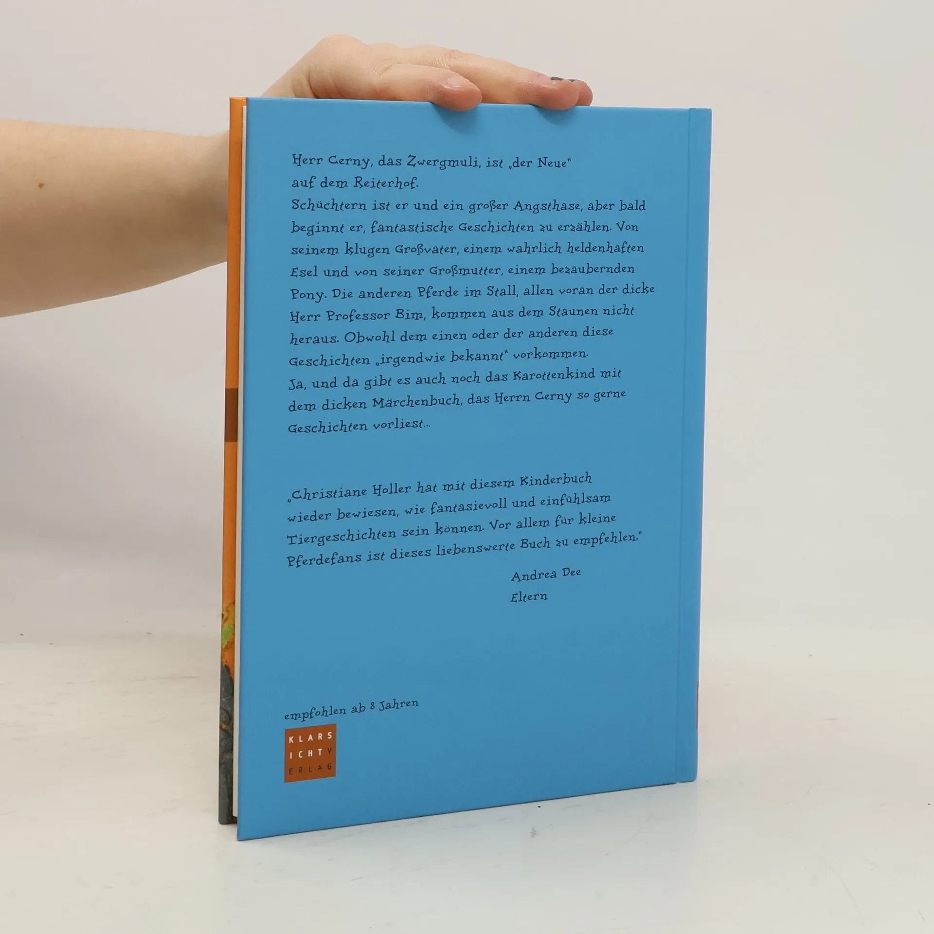 Herr Cerny, ein schüchterner Zwergmuli, erzählt auf einem Reiterhof fantastische Geschichten über seine heldenhaften Großeltern. Das Buch beschreibt eine bunte Tiergemeinschaft und deren Begegnungen, ergänzt durch Menschen und das Karottenkind, das Grimm-Märchen vorliest. Es wird als fantasievoll und empfehlenswert für kleine Pferdefans gelobt.