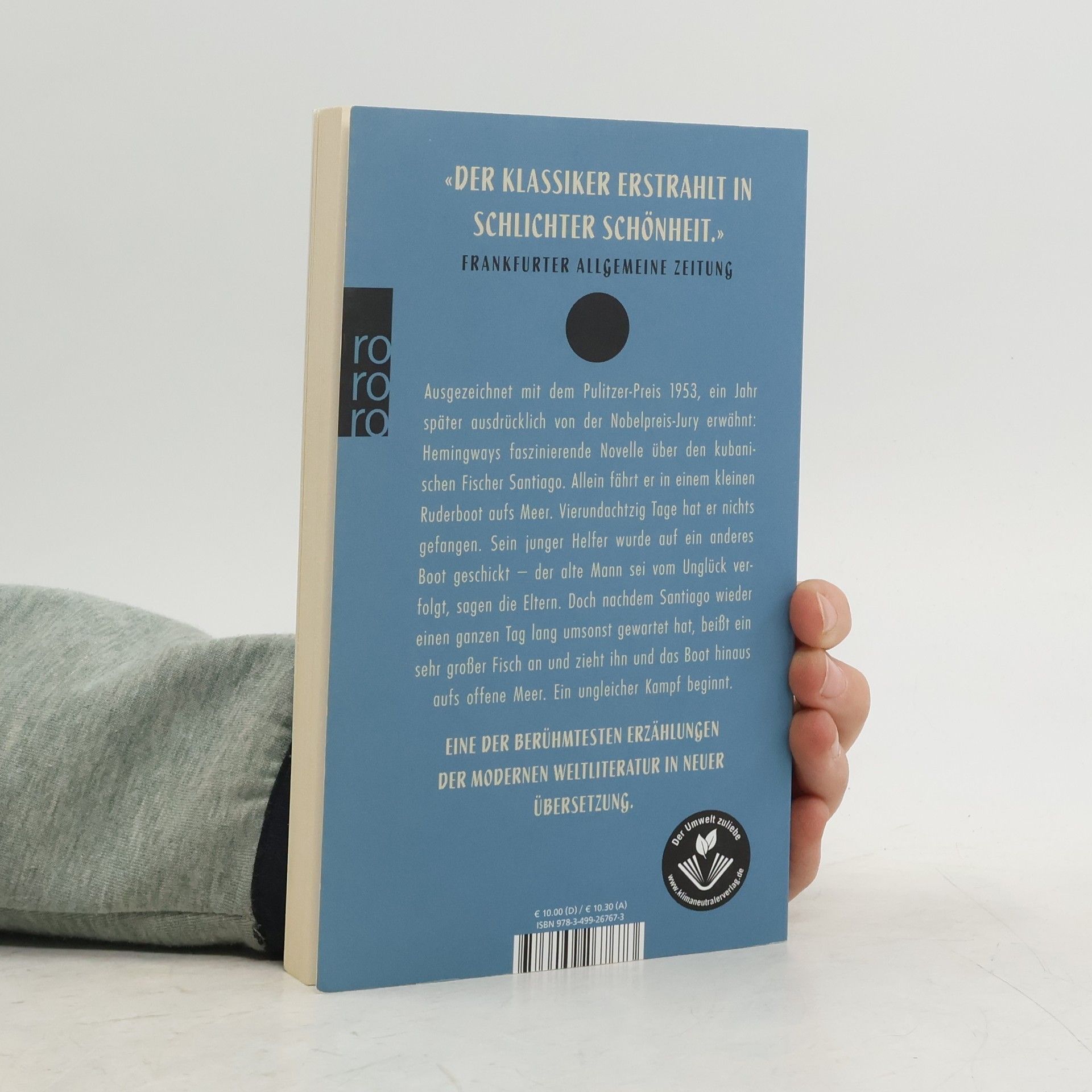 Ausgezeichnet mit dem Pulitzer-Preis 1953, ein Jahr später ausdrücklich von der Nobelpreis-Jury erwähnt: Hemingways faszinierende Novelle über den kubanischen Fischer Santiago. Allein fährt der in einem kleinen Ruderboot aufs Meer. Vierundachtzig Tage hat er nichts gefangen. Sein junger Helfer wurde auf ein anderes Boot geschickt – der alte Mann sei vom Unglück verfolgt, sagen die Eltern. Doch nachdem Santiago wieder einen ganzen Tag lang umsonst gewartet hat, beißt ein sehr großer Fisch an und zieht ihn und das Boot hinaus aufs offene Meer. Ein ungleicher Kampf beginnt. Eine der berühmtesten Erzählungen der modernen Weltliteratur in neuer Übersetzung.