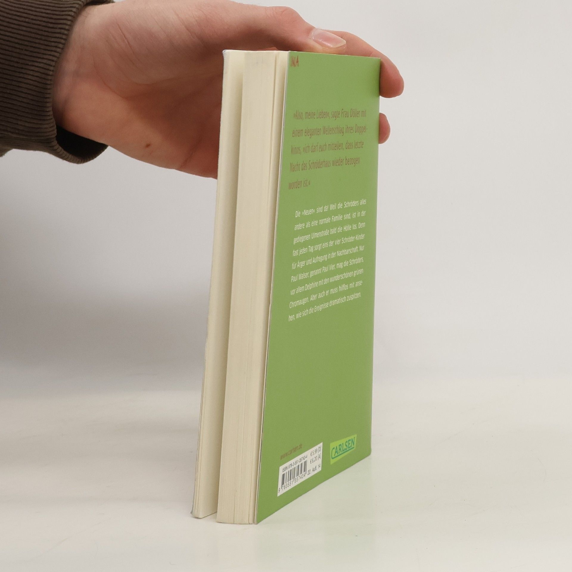Die »Neuen« sind da! Weil die Schröders alles andere als eine normale Familie sind, ist in der gediegenen Ulmenstraße bald die Hölle los. Denn fast jeden Tag sorgt eins der vier Schröder-Kinder für Ärger und Aufregung in der Nachbarschaft. Nur Paul Walser, genannt Paul Vier, mag die Schröders, vor allem Delphine mit den wunderschönen grünen Chromaugen. Aber auch er muss hilflos mit ansehen, wie sich die Ereignisse dramatisch zuspitzen.
