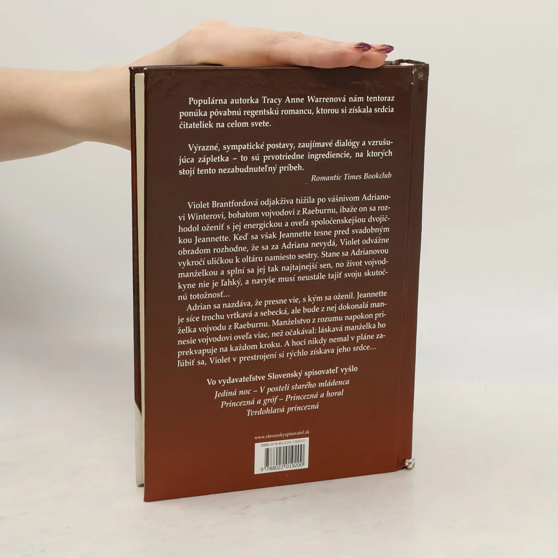 Očarujúca regentská romanca obľúbenej autorky. Violet Brantfordová odjakživa túžila po Adrianovi Winterovi, vojvodovi z Raeburnu, ibaže on sa rozhodol oženiť s jej dvojičkou Jeannette. Keď sa však Jeannette tesne pred obradom rozhodne, že sa za Adriana nevydá, Violet odvážne vykročí uličkou k oltáru namiesto nej. Splní sa jej tak najtajnejší sen, no život vojvodkyne nie je ľahký a navyše musí neustále tajiť svoju skutočnú totožnosť... Adrian sa nazdáva, že vie, s kým sa oženil. Jeannette je síce trochu vrtkavá a sebecká, ale bude z nej dokonalá manželka vojvodu. Manželstvo z rozumu napokon prinesie vojvodovi viac, než očakával: láskavá manželka ho prekvapuje na každom kroku. A hoci nikdy nemal v úmysle zaľúbiť sa, Violet v prestrojení si rýchlo získava jeho srdce...