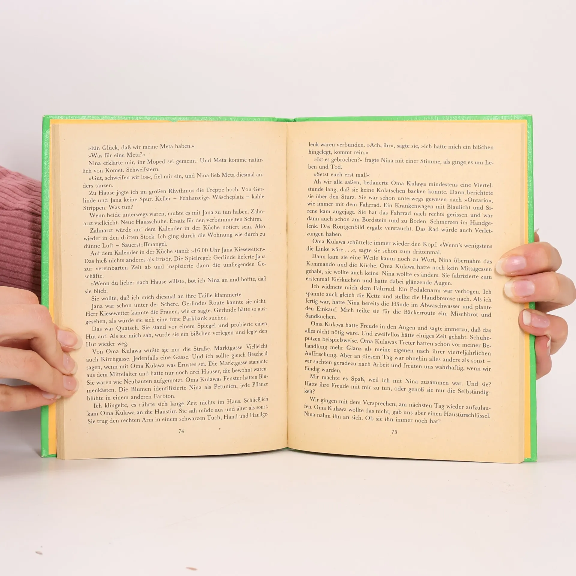 "Komiker" hatte sie zu mir gesagt, und ziemlich abfällig. Und von oben herab, von diesem stinkenden 'Enduro' herunter. Sie bildete sich vielleicht ein, mit diesem Haufen Blech unterm Hintern wäre sie was Besseres. Nee, Donna Wasserblau, nicht mit mir! Nicht mit Wolf Krautzig. Sollte sie einen Freund haben in der Zehnten oder Elften oder auf den Fidschiinseln, meinetwegen, sollte sie!" - Aber so leicht geht Wolf die hübsche Nina nicht aus dem Sinn. Mit ihr machten die Frühjahrsarbeiten im Garten richtig Spaß, zu denen Vater ihn während seiner Abwesenheit vergattert hatte. Und Nina gefiel doch auch die Selbständigkeit, die sie an Wolfs Seite auskosten konnte. Ein Telegramm vom Vater an Wolf - und an Nina! - bringt Wolf wieder auf die Beine, genauer: aufs Fahrrad!.