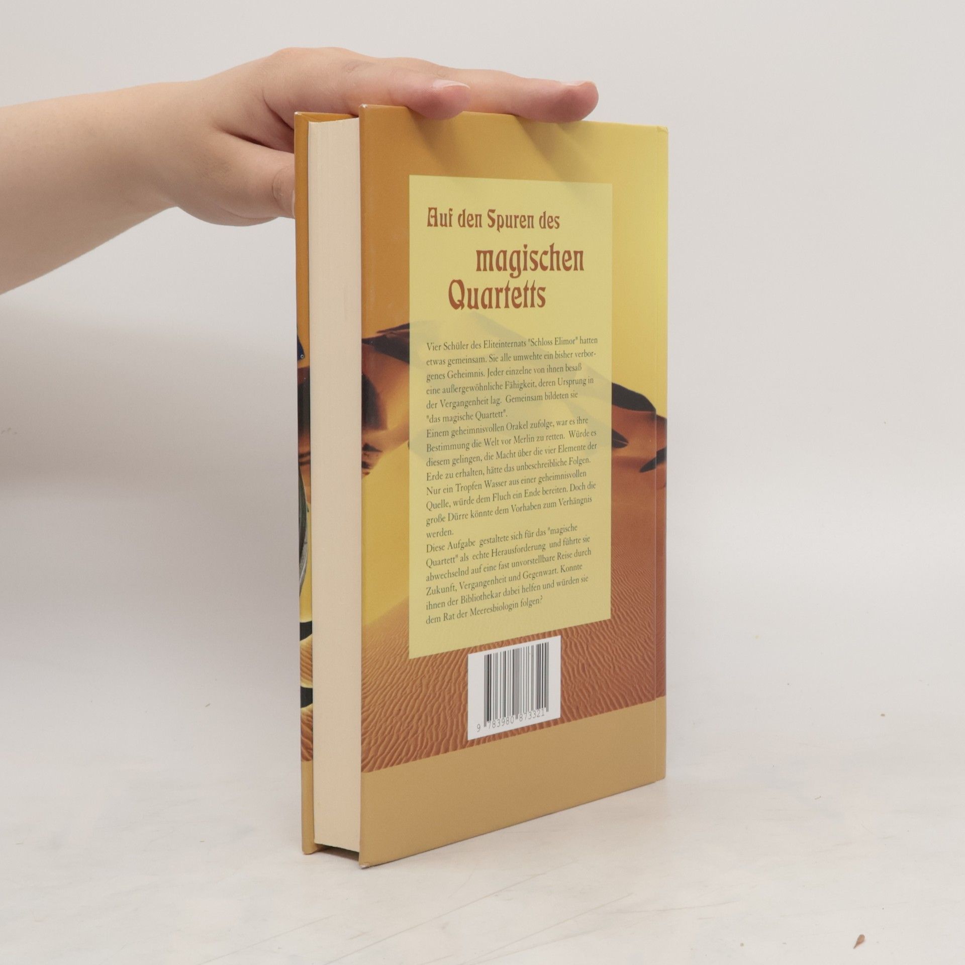 Klappentext: Vier Schüler des Eliteinternats "Schloss Elimor" hatten etwas gemeinsam. Sie alle umwehte ein bisher veborgenes Geheimnis. Jeder einzelne von ihnen besass eine aussergewöhnliche Fähigkeit, deren Ursprung in der Vergangenheit lag. Gemeinsam bildeten sie das "magische Quartett". Einem geheimnisvollen Orakel zufolge, war es ihre Bestimmung die Welt vor Merlin zu retten Würde es diesem gelingen, die Macht über die vier Elemente der Erde zu erhalten, hätte das unbeschreibliche Folgen. Nur ein Tropfen Wasser aus einer geheimnisvollen Quelle, würde den Fluch ein Ende bereiten. Doch die grosse Dürre könnte dem Vorhaben zum Verhängnis werden. Diese Aufgabe gestaltete sich für das magische Quartett als echte Herausforderung und fürhte sie abwechselnd auf eine fast unvorstellbare Reise durch Zukunft, Gegenwart und Vergangenheit. Konnte ihnen der Bibliothekar dabei helfen und würden sie dem Rat der Meeresbiologin folgen?