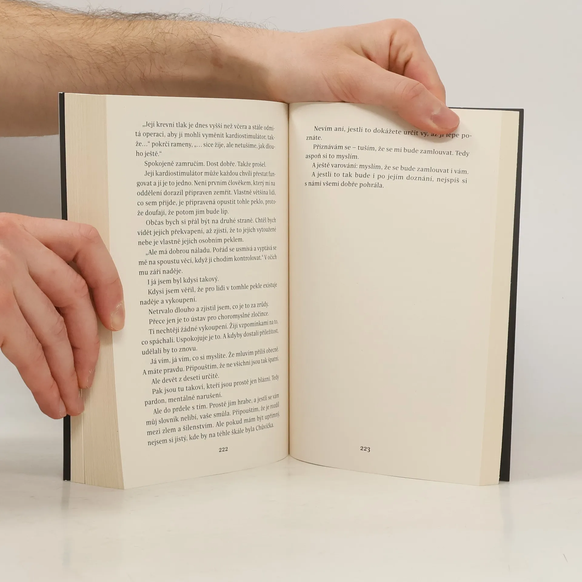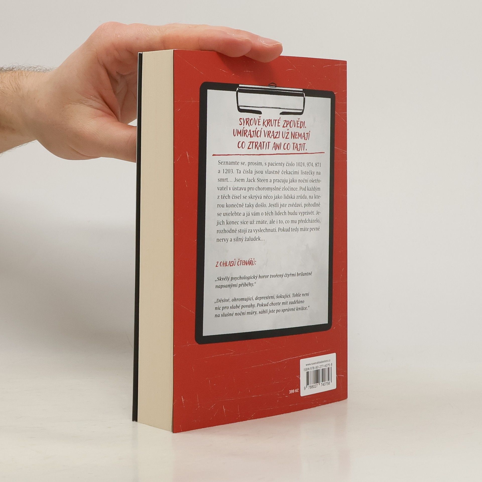 Přivážejí je živé. Odvážejí je mrtvé. Ale napřed mi musejí svěřit svoji zpověď. Jmenuji se Jack Steen. To jméno by pro vás nemělo nic znamenat. Pokud se nechystáte umřít. To se pak ze mě stává váš zasraný anděl strážný. Pracuji jako noční ošetřovatel v ústavu pro choromyslné zločince. Moje jméno je jediné pravé jméno, které v téhle knize najdete. Neřeknu vám, v jaké nemocnici pracuju. Neřeknu vám jména těch umírajících. Ale nebudu vám lhát. To, co si tu přečtete, je přesně to, co mi řekli. Jestli máte za ušima a jestli jste dost pomatení na to, abyste četli mezi řádky, dojde vám, kdo tenhle příběh vypráví. Možná se mi jen snaží zblbnout hlavu a sehrát se mnou svou poslední hru. A možná, že zblbnou hlavu i vám. V téhle knize najdete čtyři zpovědi: O člověku se zajímavými chutěmi. Další o Kenovi, který by udělal cokoliv, aby byla jeho Barbie šťastná. Pak je tu Chůvička, ale takovou byste u svých dětí nechtěli. A poslední je ta nejmilejší osoba, kterou jste kdy viděli, jenže čtení její zpovědi pro vás bude hodně tvrdé.