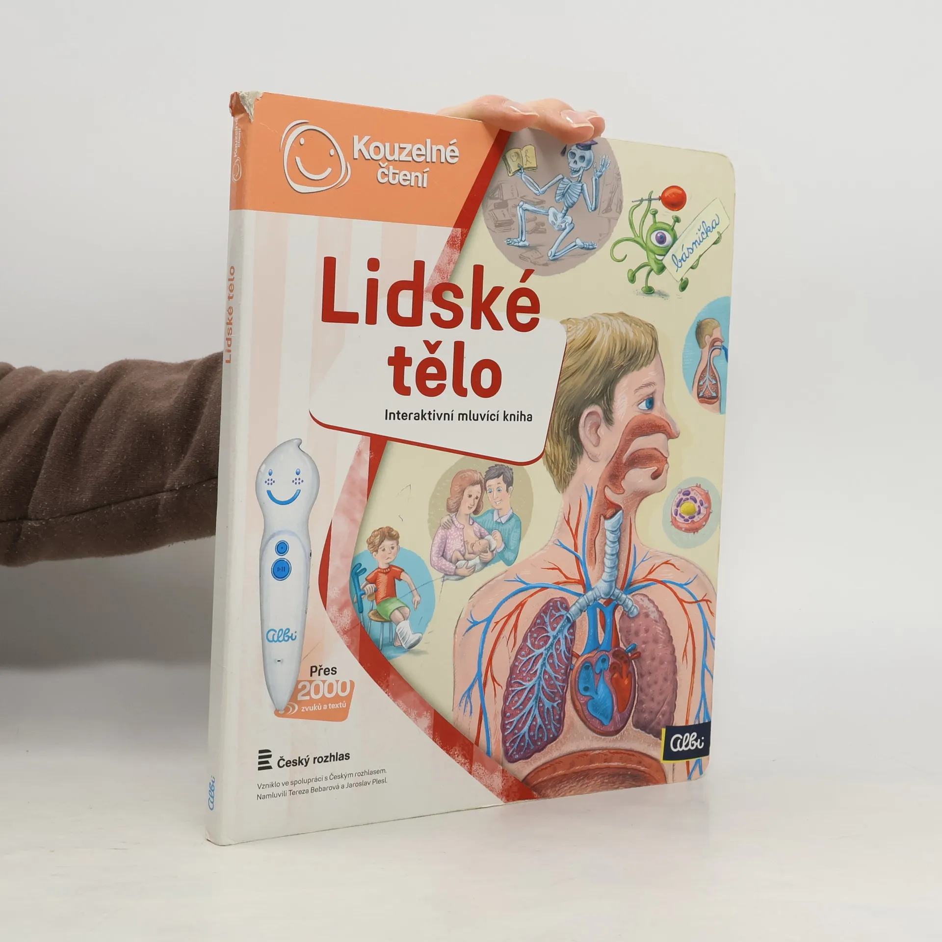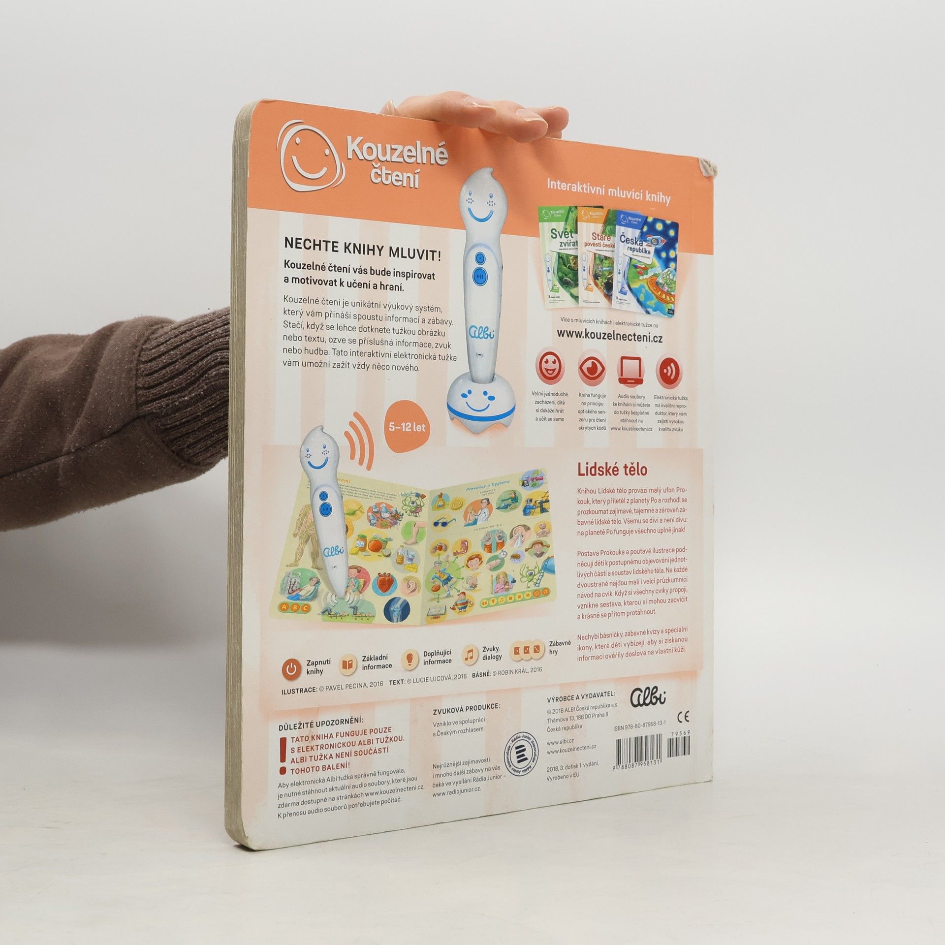 Interaktivní mluvící kniha z edice Kouzelné čtení, se kterou se děti již od 3 let dozvědí spoustu zajímavých a užitečných informací o našem těle. Knihou Lidské tělo provází malý ufon Prokouk, který přiletěl z planety Po, aby prozkoumal taje lidského těla. Všemu se diví a není divu: na planetě Po funguje všechno úplně jinak! Postava Prokouka a poutavé ilustrace podněcují děti k postupnému objevování jednotlivých částí a soustav lidského těla. Kniha je členěna do 8 kapitol a témata jsou např. Kosti a svaly, Mozek a nervy, Rozmnožování, Trávicí soustava, Srdce a plíce atd. Na každé dvoustraně najdou malí i velcí průzkumníci návod na cvik. Když si všechny cviky propojí, vznikne sestava, kterou si mohou zacvičit a krásně se přitom protáhnout. V knize Lidské tělo najdete také básničky, zábavné kvízy a speciální ikony, které děti vybízí, aby si získanou informaci zkusili doslava na vlastní kůži. Kniha obsahuje téměř 2000 zvuků a textů. Knihu ilustroval Pavel Pecina, básničky napsal Robin Král, texty Lucie Ujcová. Vzniklo ve spolupráci s Českým rozhlasem, knihu namluvili Tereza Bebarová a Jaroslav Plesl.