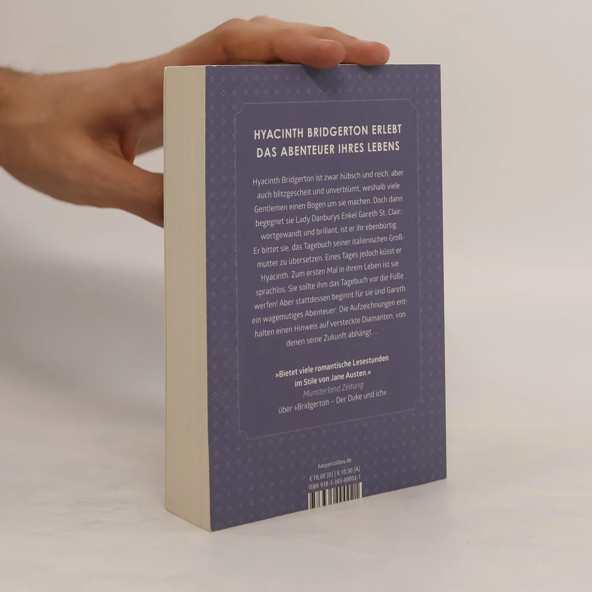 Hyacinth Bridgerton erlebt das Abenteuer ihres Lebens Hyacinth Bridgerton ist zwar hübsch und reich, aber auch blitzgescheit und unverblümt, weshalb viele Gentlemen einen Bogen um sie machen. Doch dann begegnet sie Lady Danburys Enkel Gareth St. Clair: wortgewandt und brillant, ist er ihr ebenbürtig. Er bittet sie, das Tagebuch seiner italienischen Großmutter zu übersetzen. Eines Tages jedoch küsst er Hyacinth. Zum ersten Mal in ihrem Leben ist sie sprachlos. Sie sollte ihm das Tagebuch vor die Füße werfen! Aber stattdessen beginnt für sie und Gareth ein wagemutiges Abenteuer: Die Aufzeichnungen enthalten einen Hinweis auf versteckte Diamanten, von denen seine Zukunft abhängt ... »Bietet viele romantische Lesestunden im Stile von Jane Austen.« Münsterland Zeitung über »Bridgerton– Der Duke und ich« »Das siebte und zweitletzte Buch der Bridgerton-Reihe fesselt mehr denn je.« Tize