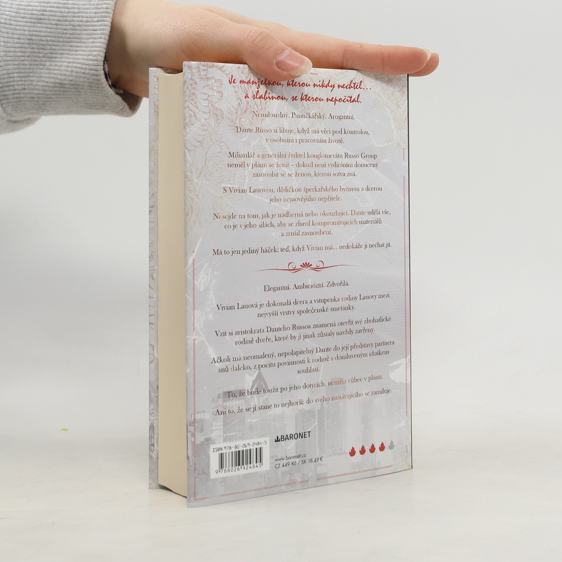 Úvodní román z další eroticko-milostné série americké autorky. Bezohledný. Arogantní. A k zešílení sexy. Dante Russo se vyžívá v kontrole, jak v osobním, tak v profesním životě. Uhrančivý miliardář a generální ředitel v jednom se nikdy neplánoval oženit. Pak ho ale hrozba vydírání donutila zasnoubit se s Vivian Lau, dědičkou šperkařského impéria a dcerou jeho nejnovějšího nepřítele. Nezáleží na tom, jak je krásná nebo okouzlující. Dante hodlá udělat vše, co je v jeho silách, aby zasnoubení zrušil. Je tu ale jeden problém: teď, když ji má... nemůže už být bez ní. Nakladatelská anotace.