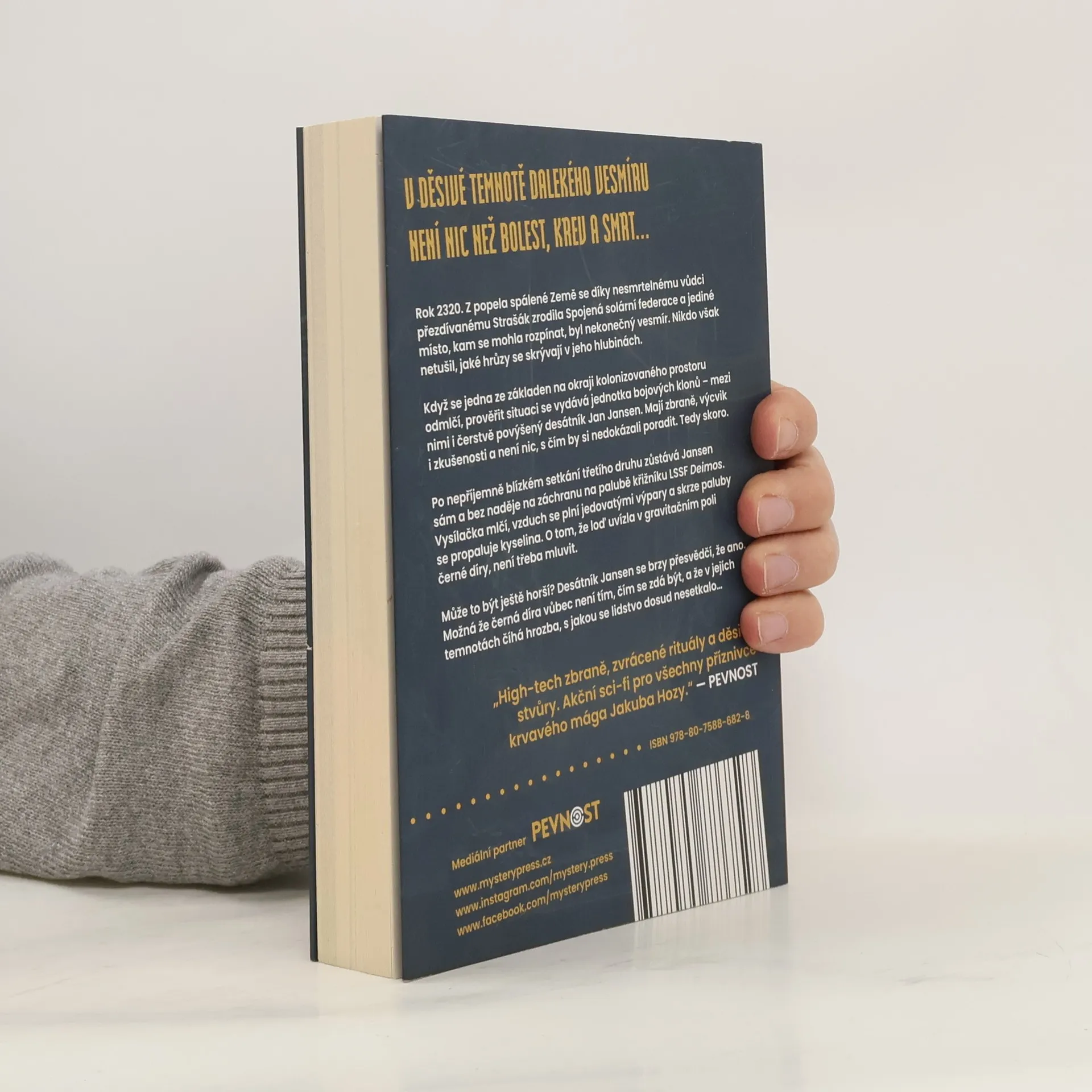 V DĚSIVÉ TEMNOTĚ DALEKÉHO VESMÍRU NENÍ NIC NEŽ BOLEST, KREV A SMRT… Rok 2320. Z popela spálené Země se díky nesmrtelnému vůdci přezdívanému Strašák zrodila Spojená solární federace a jediné místo, kam se mohla rozpínat, byl nekonečný vesmír. Nikdo však netušil, jaké hrůzy se skrývají v jeho hlubinách. Když se jedna ze základen na okraji kolonizovaného prostoru odmlčí, prověřit situaci se vydává jednotka bojových klonů – mezi nimi i čerstvě povýšený desátník Jan Jansen. Mají zbraně, výcvik i zkušenosti a není nic, s čím by si nedokázali poradit. Tedy skoro. Po nepříjemně blízkém setkání třetího druhu zůstává Jansen sám a bez naděje na záchranu na palubě křižníku LSSF Deimos. Vysílačka mlčí, vzduch se plní jedovatými výpary a skrze paluby se propaluje kyselina. O tom, že loď uvízla v gravitačním poli černé díry, není třeba mluvit. Může to být ještě horší? Desátník Jansen se brzy přesvědčí, že ano. Možná že černá díra vůbec není tím, čím se zdá být, a že v jejích temnotách číhá hrozba, s jakou se lidstvo dosud nesetkalo… ___ „High-tech zbraně, zvrácené rituály a děsivé stvůry. Akční sci-fi pro všechny příznivce krvavého mága Jakuba Hozy.“ – PEVNOST