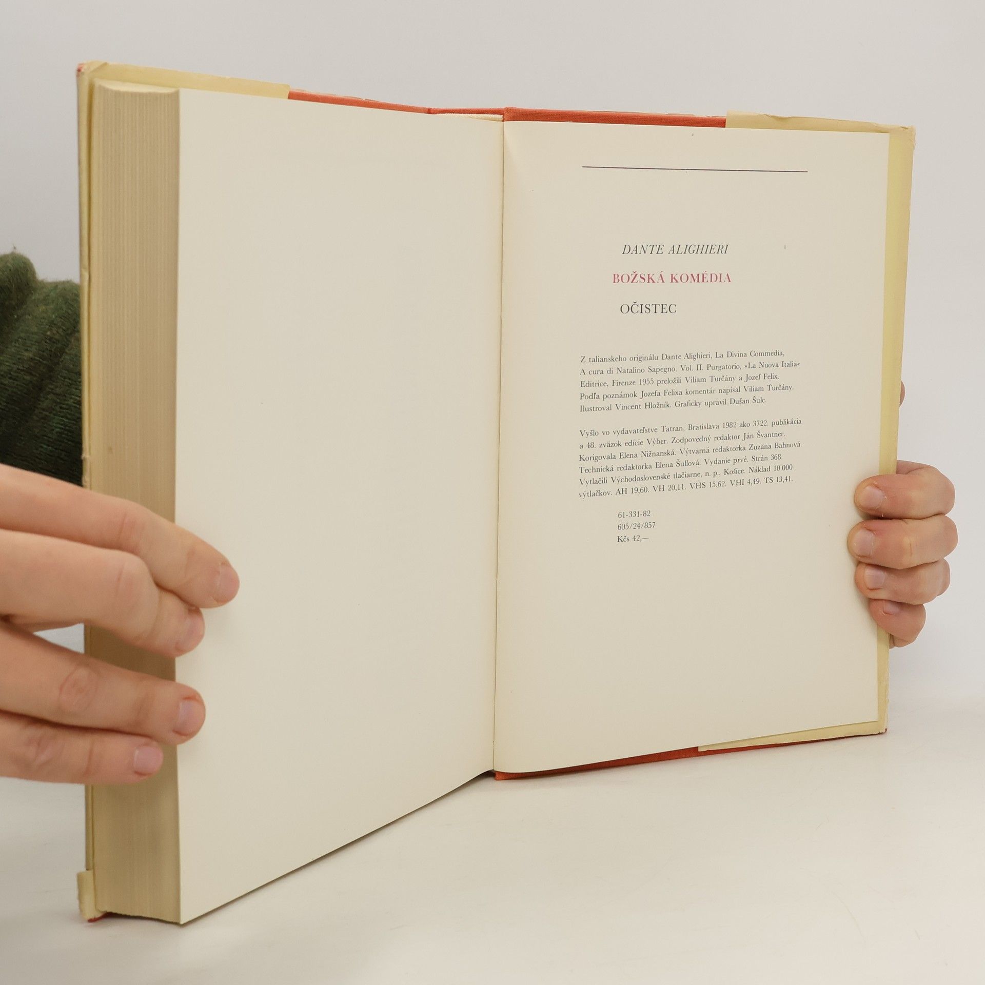 Kniha je druhou časťou slávnej a legendárnej La Divina Comedia. Dante a jeho sprievodca Vergílius pokračujú vo svojom putovaní za stratenou láskou Beatrice. Ich cesty vedú z pekla, po prelezení skrze diabla, ktorý naveky požiera dušu Judášovu, na protipól sveta mystického do očistca. Tu stretávajú duše tých, ktorí neboli na veky zatratení, ale ich duša nebola v stave blaženosti, v čase smrti ich telesnej schránky, ktorá je nutná k priamemu prechodu do bázne nebeskej a blízkosti Boha trojjedinného. Prvé vydanie. Komentár podľa poznámok J. Felixa napísal Viliam Turčány.