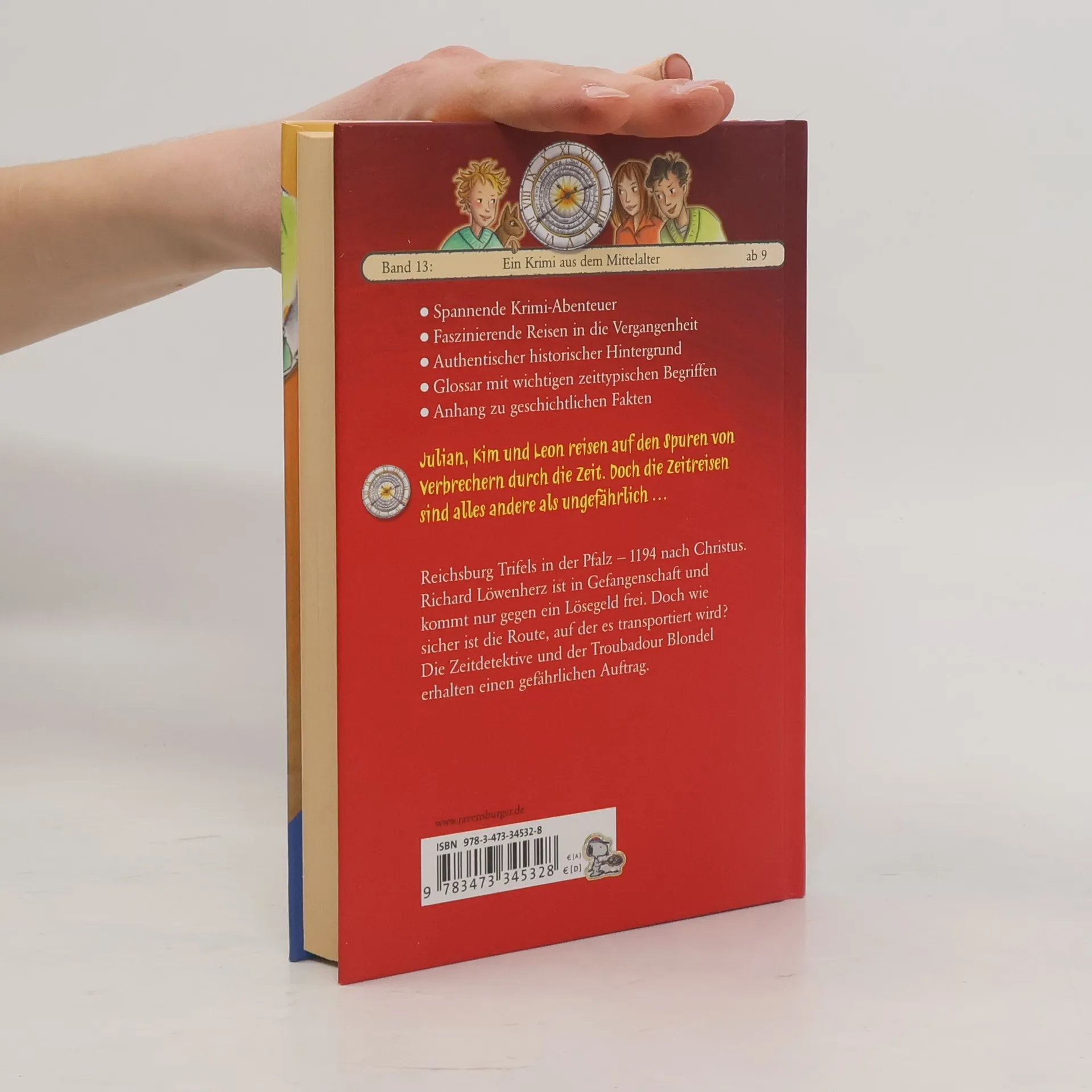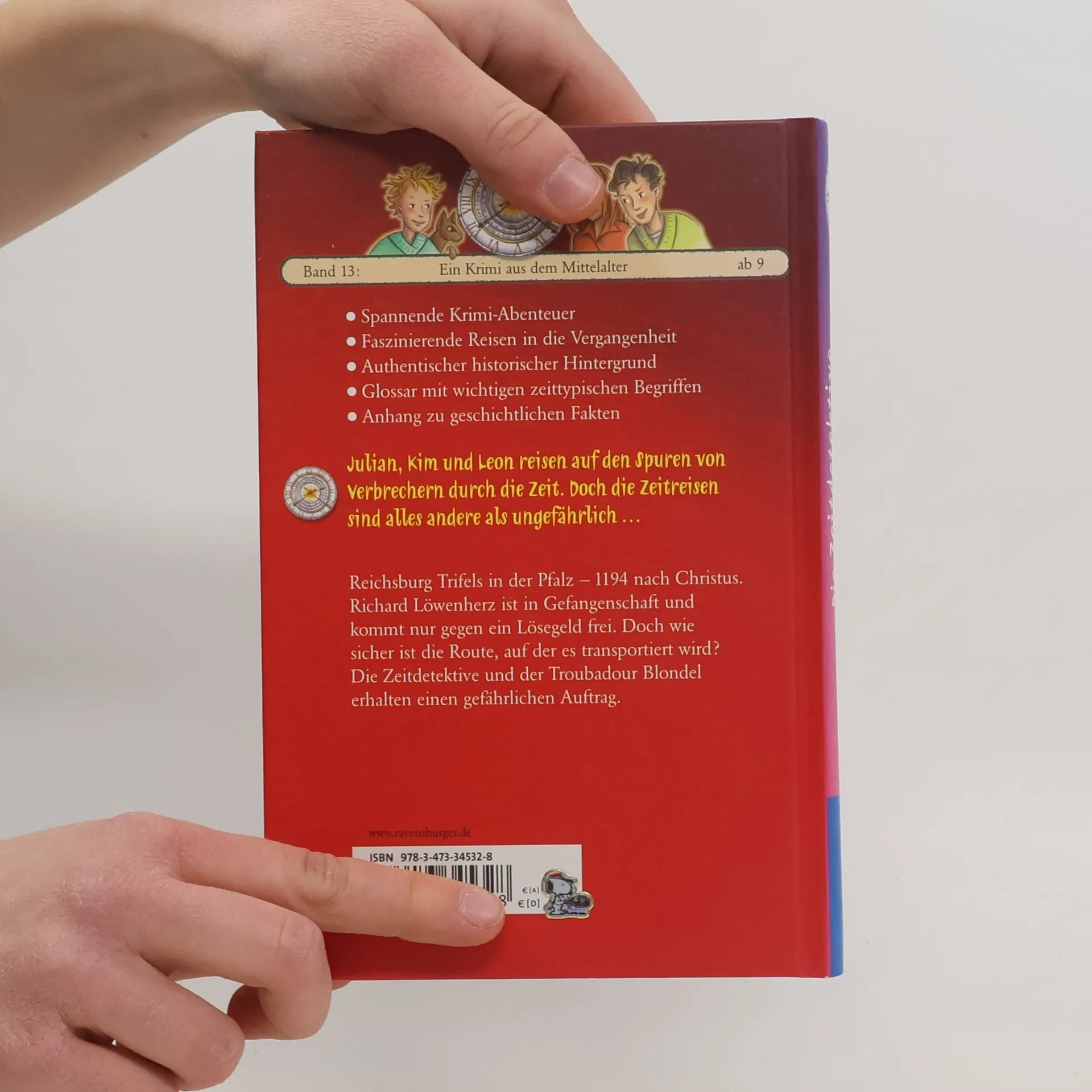 Julian, Kim und Leon reisen auf den Spuren von Verbrechern durch die Zeit. Doch die Zeitreisen sind alles andere als ungefährlich...Reichsburg Trifels in der Pfalz – 1194 nach Christus. Richard Löwenherz ist in Gefangenschaft und kommt nur gegen ein Lösegeld frei. Doch wie sicher ist die Route, auf der es transportiert wird? Die Zeitdetektive und der Troubadour Blondel erhalten einen gefährlichen Auftrag.Die Zeitdetektive erleben spannende Krimi-Abenteuer und faszinierende Reisen in die Vergangenheit in einem authentischen historischen Hintergrund.