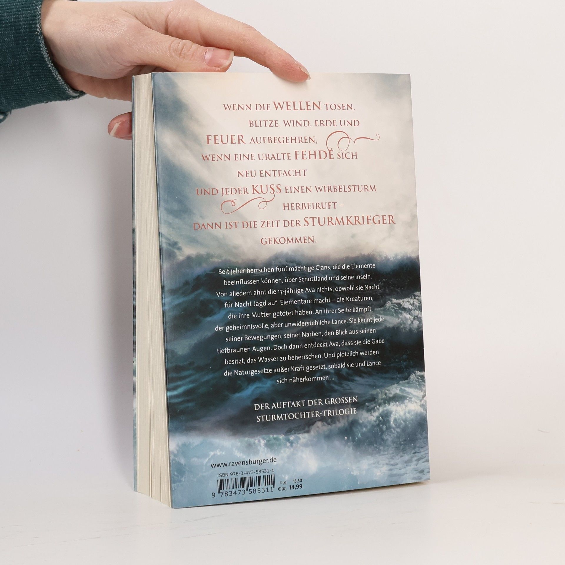 Wenn die Wellen tosen, Blitze, Wind, Erde und Feuer aufbegehren, wenn eine uralte Fehde sich neu entfacht und jeder Kuss einen Wirbelsturm herbeiruft – dann ist die Zeit der Sturmkrieger gekommen. Seit jeher herrschen fünf mächtige Clans, die die Elemente beeinflussen können, über Schottland und seine Inseln. Von alledem ahnt die 17-jährige Ava nichts, obwohl sie Nacht für Nacht Jagd auf Elementare macht – die Kreaturen, die ihre Mutter getötet haben. An ihrer Seite kämpft der geheimnisvolle, aber unwiderstehliche Lance. Sie kennt jede seiner Bewegungen, seiner Narben, den Blick aus seinen tiefbraunen Augen. Doch dann entdeckt Ava, dass sie die Gabe besitzt, das Wasser zu beherrschen. Und plötzlich werden die Naturgesetze außer Kraft gesetzt, sobald sie und Lance sich näherkommen …