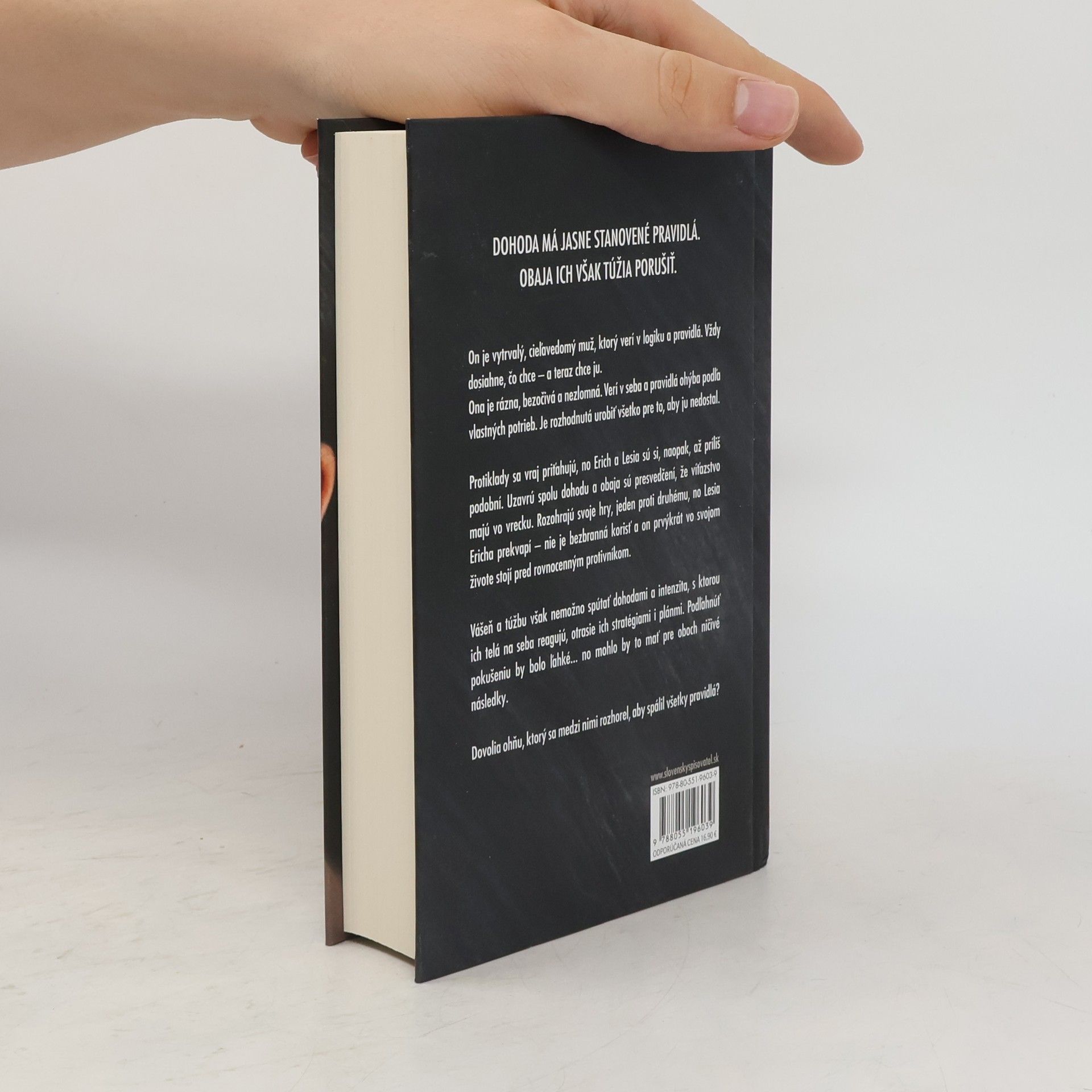 Dohoda má jasne stanovené pravidlá. Obaja ich však túžia porušiť. On je vytrvalý, cieľavedomý muž, ktorý verí v logiku a pravidlá. Vždy dosiahne, čo chce – a teraz chce ju. Ona je rázna, bezočivá a nezlomná. Verí v seba a pravidlá ohýba podľa vlastných potrieb. Je rozhodnutá urobiť všetko pre to, aby ju nedostal. Protiklady sa vraj priťahujú, no Erich a Lesia sú si, naopak, až príliš podobní. Uzavrú spolu dohodu a obaja sú presvedčení, že víťazstvo majú vo vrecku. Rozohrajú svoje hry, jeden proti druhému, no Lesia Ericha prekvapí – nie je bezbranná korisť a on prvýkrát vo svojom živote stojí pred rovnocenným protivníkom. Vášeň a túžbu však nemožno spútať dohodami a intenzita, s ktorou ich telá na seba reagujú, otrasie ich stratégiami i plánmi. Podľahnúť pokušeniu by bolo ľahké… no mohlo by to mať pre oboch ničivé následky. Dovolia ohňu, ktorý sa medzi nimi rozhorel, aby spálil všetky pravidlá?