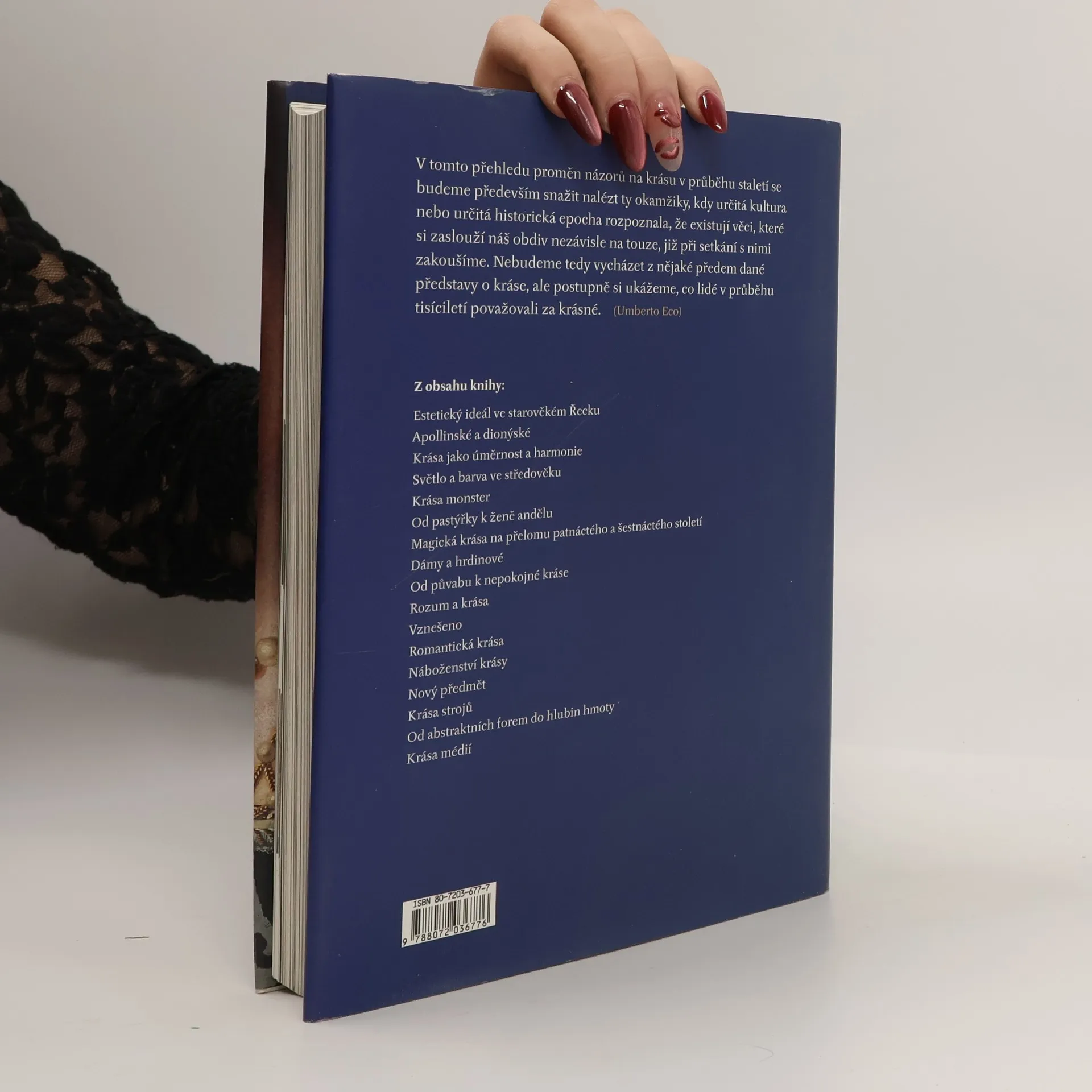 Na stránkách této knihy, jejímž editorem je Umberto Eco, najdeme obrazy mistrovských děl všech dob. Ilustrace i rozsáhlá antologie textů čtenáři přibližují rozmanité představy o kráse, jak se projevovaly od dob starého Řecka až dodnes.