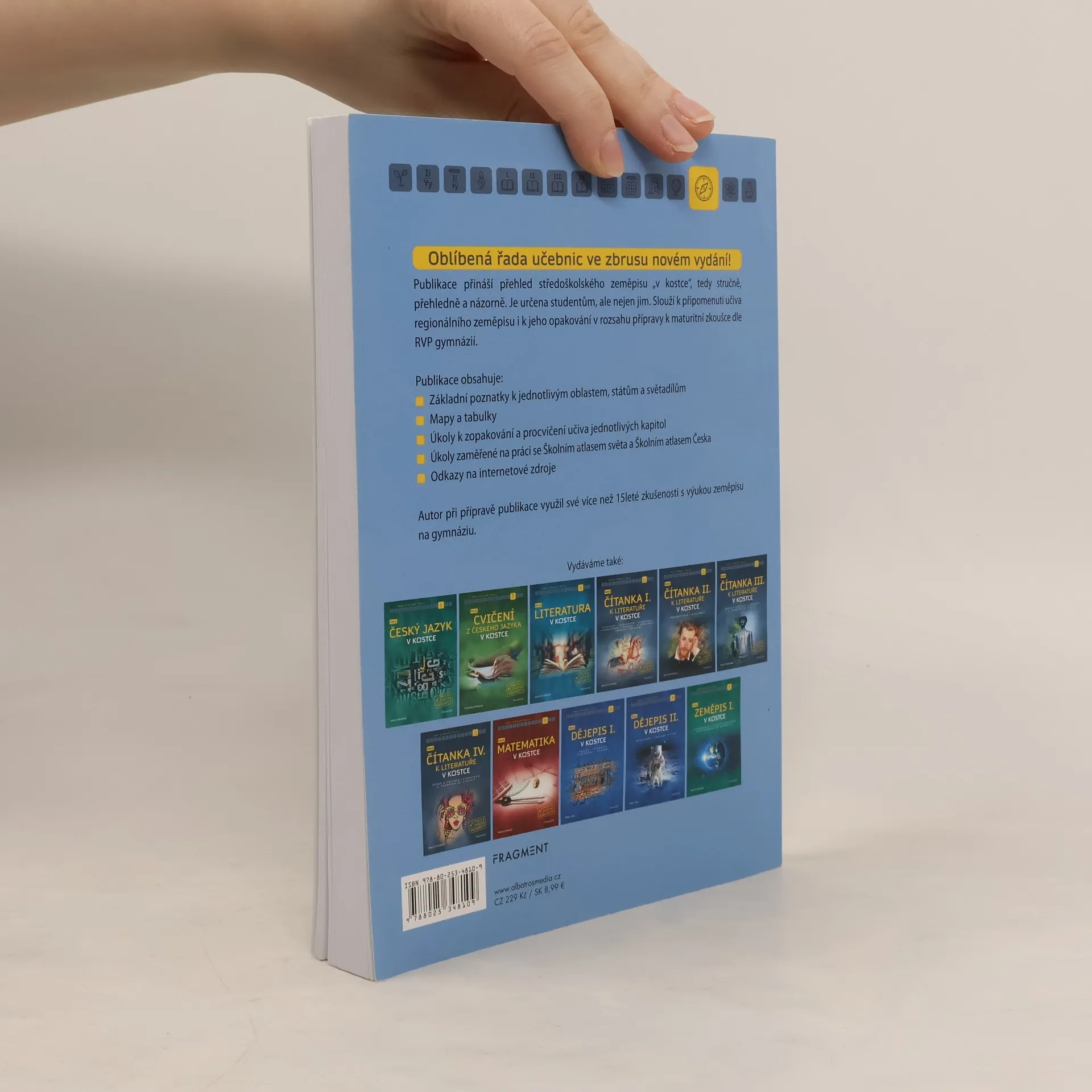Publikace přináší přehled středoškolského zeměpisu „v kostce“, tedy stručně a přehledně. Slouží k připomenutí učiva obecného zeměpisu i k jeho opakování v rozsahu přípravy k maturitní zkoušce dle RVP gymnázií. Publikace obsahuje základní teorii z oblasti fyzické a socioekonomické geografie. Nechybí mapy, tabulky a schémata, soubory otázek k zopakování vybraného tématu či úlohy pro práci s mapou.
