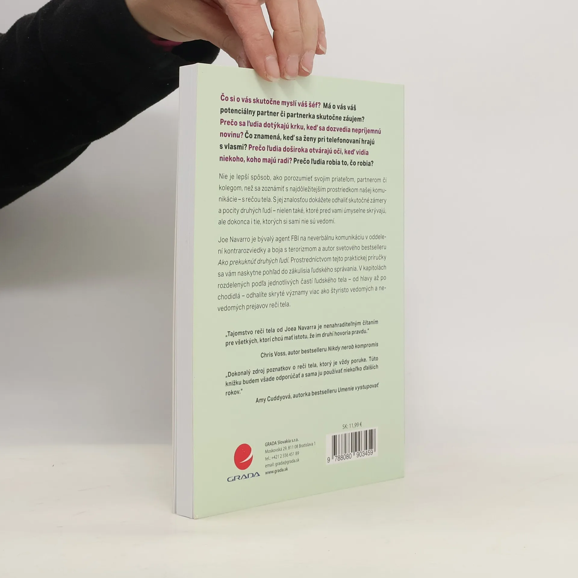 Čo si o vás skutočne myslí váš šéf? Má o vás váš potenciálny partner či partnerka skutočne záujem? Prečo sa ľudia dotýkajú krku, keď sa dozvedia nepríjemnú novinu? Čo znamená, keď sa ženy pri telefonovaní hrajú s vlasmi? Prečo ľudia doširoka otvárajú oči, keď vidia niekoho, koho majú radi? Prečo ľudia robia to, čo robia? Nie je lepší spôsob, ako porozumieť svojim priateľom, partnerom či kolegom, než sa zoznámiť s najdôležitejším prostriedkom našej komunikácie – s rečou tela. S jej znalosťou dokážete odhaliť skutočné zámery a pocity druhých ľudí – nielen také, ktoré pred vami úmyselne skrývajú, ale dokonca i tie, ktorých si sami nie sú vedomí. Joe Navarro je bývalý agent FBI na neverbálnu komunikáciu v oddelení kontrarozviedky a boja s terorizmom a autor svetového bestselleru Ako prekuknúť druhých ľudí. Prostredníctvom tejto praktickej príručky sa vám naskytne pohľad do zákulisia ľudského správania. V kapitolách rozdelených podľa jednotlivých častí ľudského tela – od hlavy až po chodidlá – odhalíte skryté významy viac ako štyristo vedomých a nevedomých prejavov reči tela.