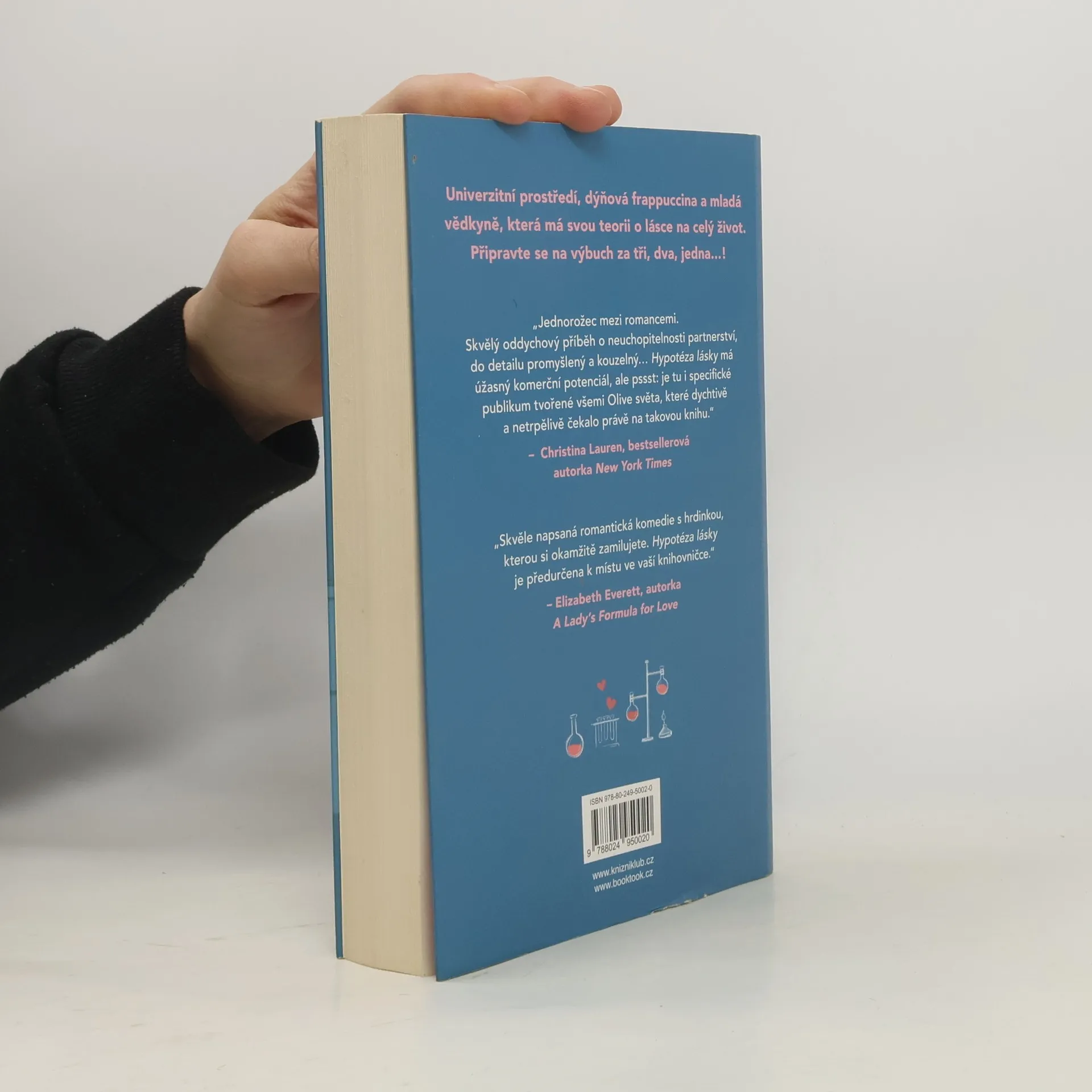 Romantická komedie, která zbořila sociální sítě! Olive je doktorandka na Stanfordu. Na trvalé romantické vztahy příliš nevěří, zato její nejlepší kamarádka ano. Takže pokud ji chce přesvědčit, že s někým randí a její milostný život nabral správný směr, musí na to jít chytře. Vědci totiž potřebují důkazy. Proto Olive, jako každá jiná sebevědomá bioložka, zpanikaří a políbí prvního muže, na kterého narazí – Adama Carlsena. Mladý, v oboru uznávaný profesor má pověst přísného školitele. Byl tak jejich polibek největší chybou, kterou Olive v životě udělala, nebo se tohle setkání může vyvinout v něco víc? Kniha obsahuje také bonusovou kapitolu.