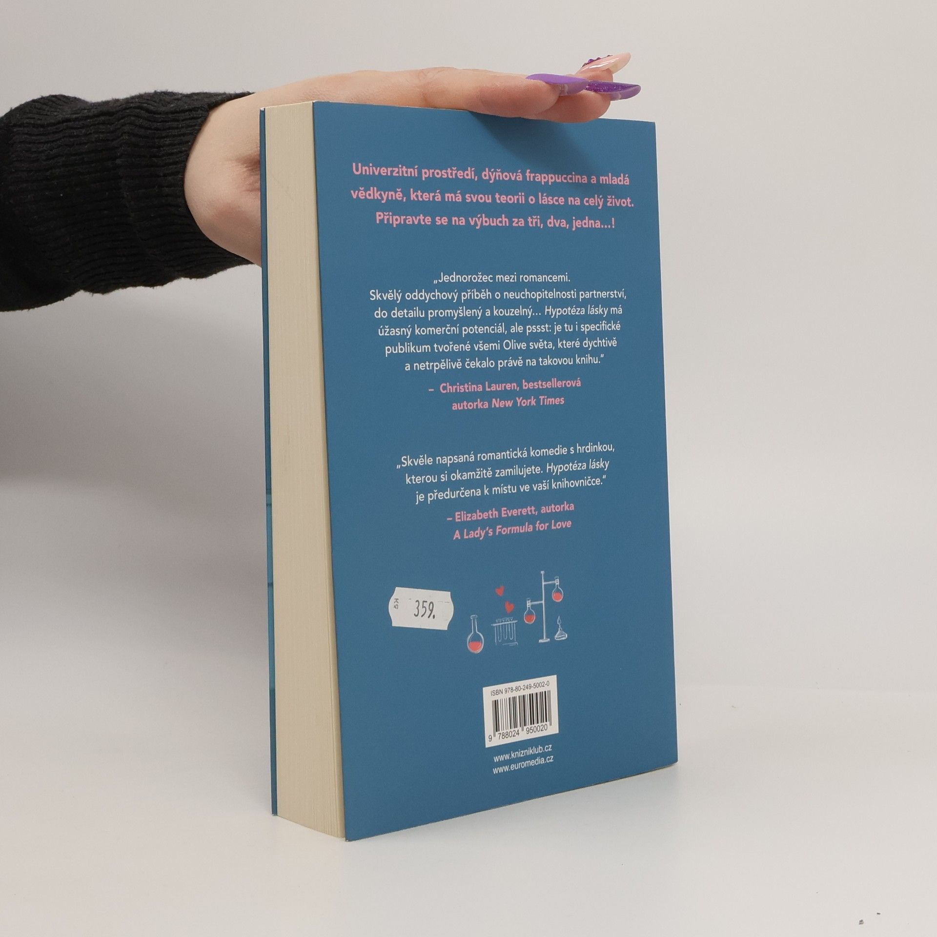 Romantická komedie, která zbořila sociální sítě! Olive je doktorandka na Stanfordu. Na trvalé romantické vztahy příliš nevěří, zato její nejlepší kamarádka ano. Takže pokud ji chce přesvědčit, že s někým randí a její milostný život nabral správný směr, musí na to jít chytře. Vědci totiž potřebují důkazy. Proto Olive, jako každá jiná sebevědomá bioložka, zpanikaří a políbí prvního muže, na kterého narazí – Adama Carlsena. Mladý, v oboru uznávaný profesor má pověst přísného školitele. Byl tak jejich polibek největší chybou, kterou Olive v životě udělala, nebo se tohle setkání může vyvinout v něco víc? Kniha obsahuje také bonusovou kapitolu.