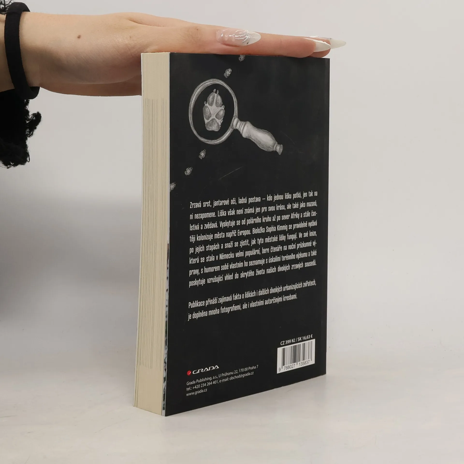 Zrzavá srst, jantarové oči, ladná postava – kdo jednou lišku potká, jen tak na ni nezapomene. Liška však není známá jen pro svou krásu, ale také jako mazaná, lstivá a zvědavá. Vyskytuje se od polárního kruhu až po sever Afriky a stále častěji kolonizuje města napříč Evropou.Bioložka Sophia Kimmig se pravidelně vydává po jejích stopách a snaží se zjistit, jak tyto městské lišky fungují.Ve své knize, která se stala v Německu velmi populární, bere čtenáře na noční průzkumné výpravy, s humorem sobě vlastním ho seznamuje s úskalími terénního výzkumu a také poskytuje vzrušující vhled do skrytého života našich divokých zrzavých sousedů. Publikace přináší také zajímavá fakta o liškách, ale i dalších divokých urbanizujících tvorech, je doplněna mnoha fotografiemi, ale i vlastními autorčinými kresbami.