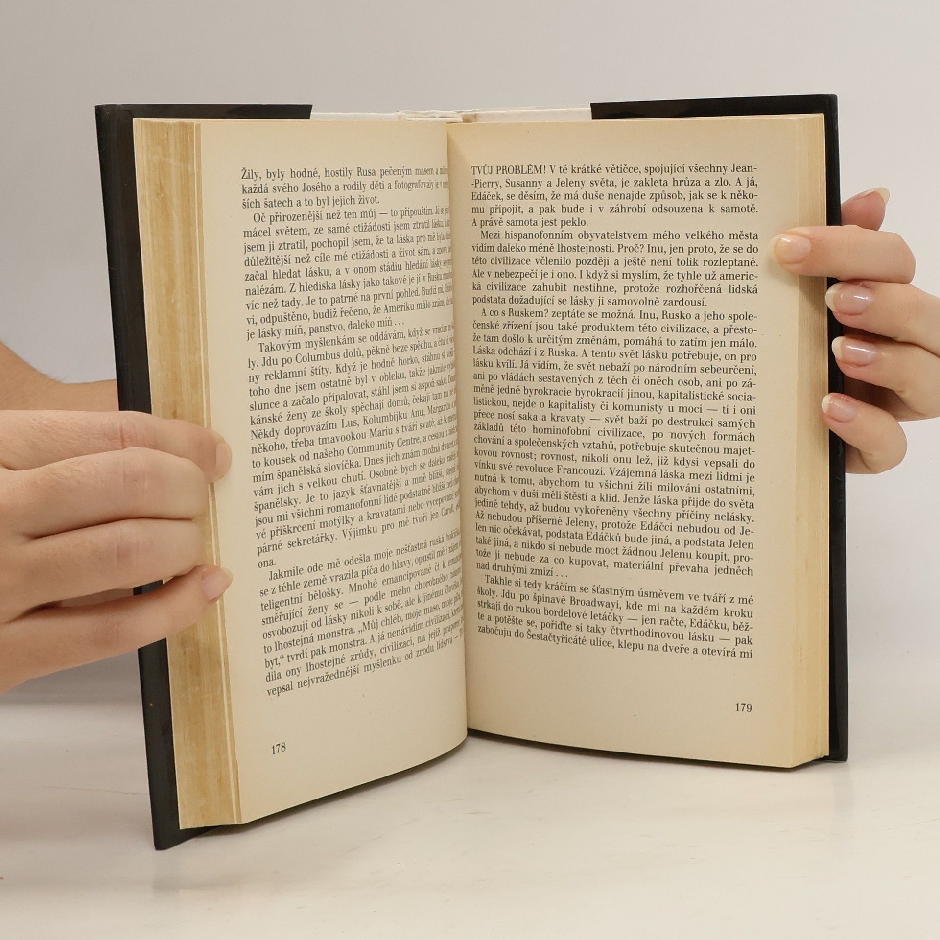 Edáček je ruský emigrant žijící v USA. V rodném SSSR byl básníkem, který nesměl publikovat, v USA mu sice v ničem nebrání politický režim, ale výsledek je vlastně tentýž, protože jeho poezie není komerčně zajímavá a nikdo na ni není zvědavý, takže semtam něco pošle do ruských emigrantských novin a je živ ze sociální podpory a příležitostných pomocných prací. Stále se mu stýská po rodné zemi a ještě více po manželce Jeleně, která mu utekla s bohatým Američanem. Celá kniha je o citovém vykořenění a hledání blízkosti. Blízkost hledá Edáček ve vztazích a sexu se ženami i muži, přičemž autor při popisu vůbec nešetří velmi podrobnými detaily těchto sexuálních epizod.... celý text