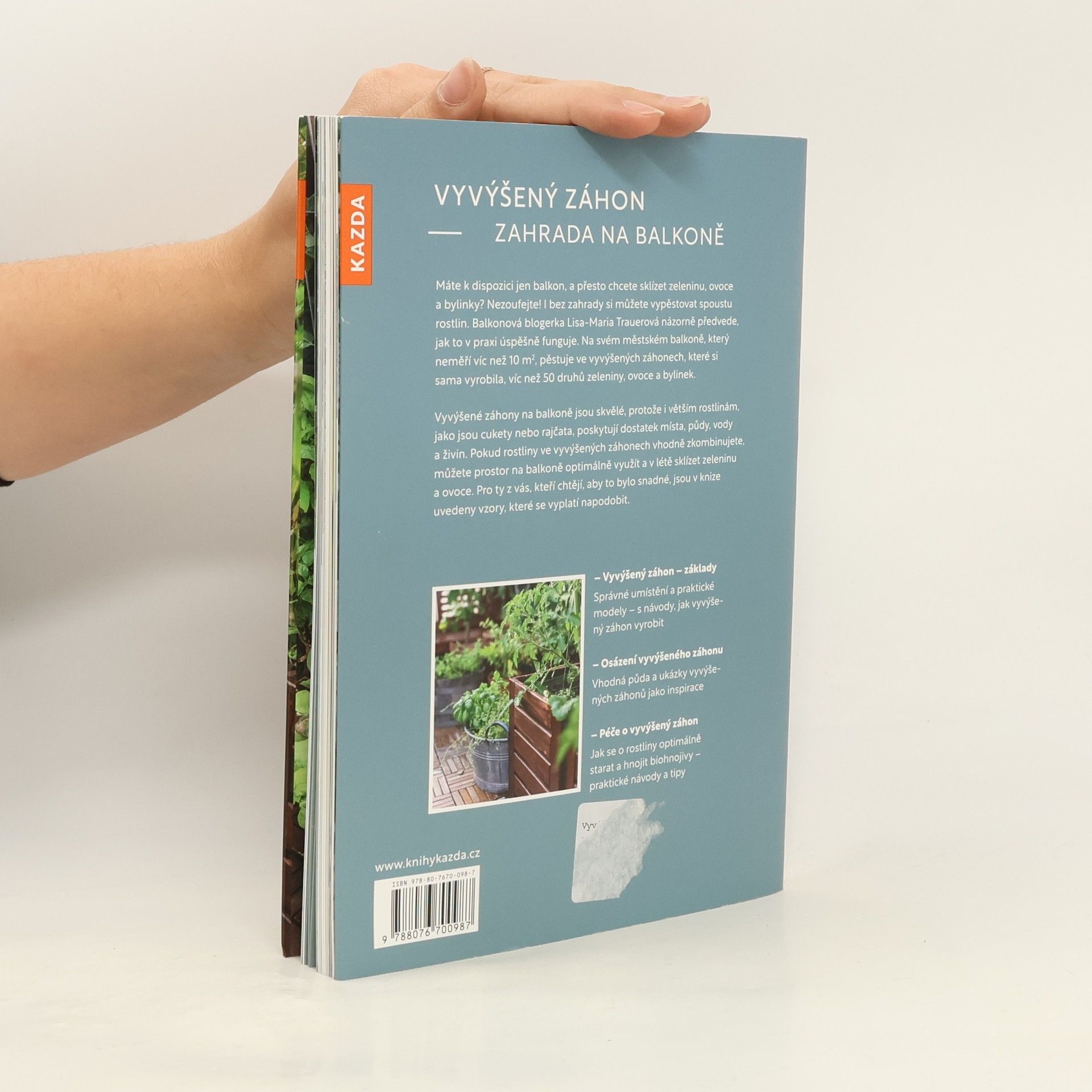 Máte k dispozici jen balkon, a přesto chcete sklízet zeleninu, ovoce a bylinky? Nezoufejte! I bez zahrady si můžete vypěstovat spoustu rostlin. Balkonová blogerka Lisa-Maria Trauerová názorně předvede, jak to v praxi úspěšně funguje. Na svém městském balkoně, který neměří víc než 10 m2, pěstuje ve vyvýšených záhonech, které si sama vyrobila, víc než 50 druhů zeleniny, ovoce a bylinek. Vyvýšené záhony na balkoně jsou skvělé, protože i větším rostlinám, jako jsou cukety nebo rajčata, poskytují dostatek místa, půdy, vody a živin. Pokud rostliny ve vyvýšených záhonech vhodně zkombinujete, můžete prostor na balkoně optimálně využít a v létě sklízet zeleninu a ovoce. Pro ty z vás, kteří chtějí, aby to bylo snadné, jsou v knize uvedeny vzory, které se vyplatí napodobit.