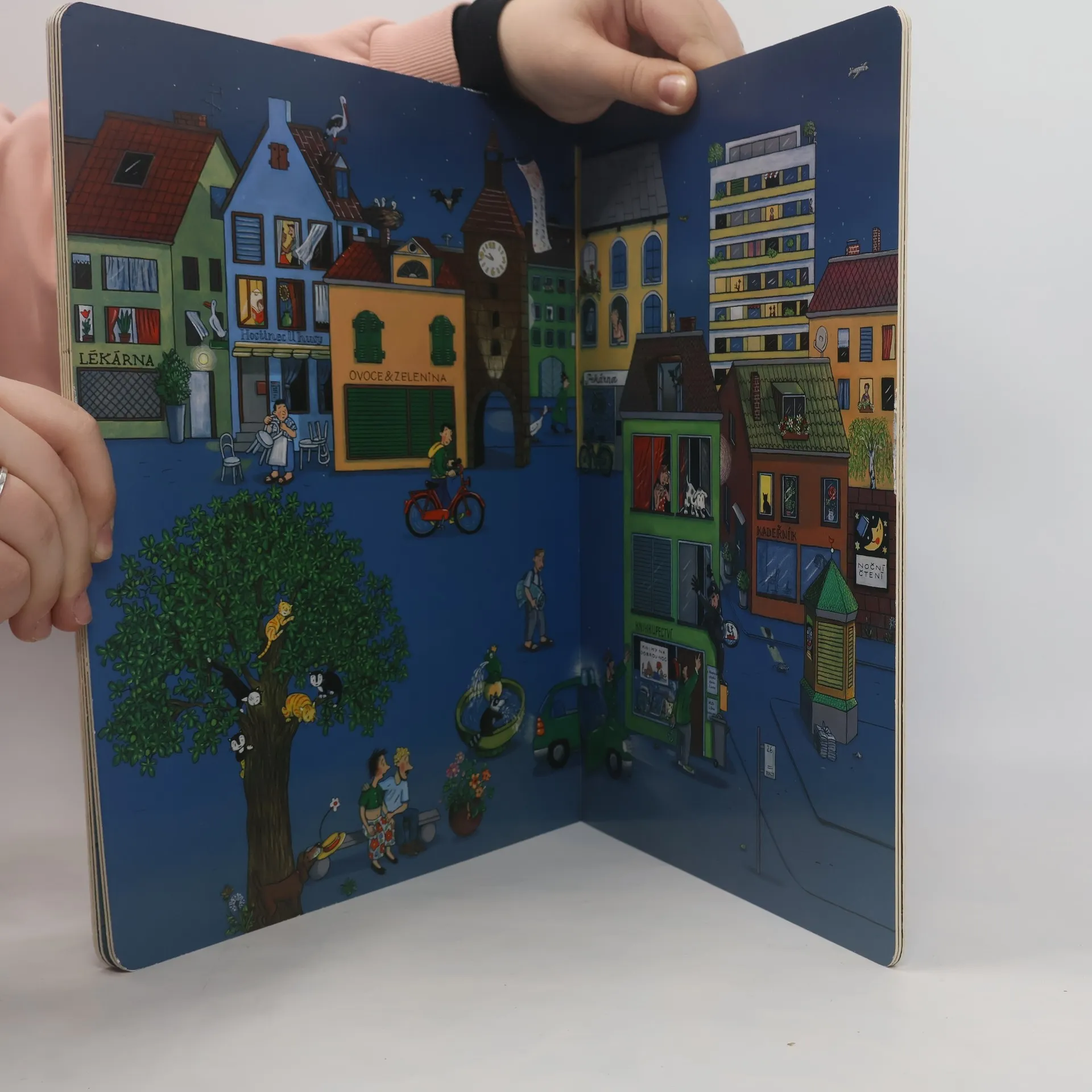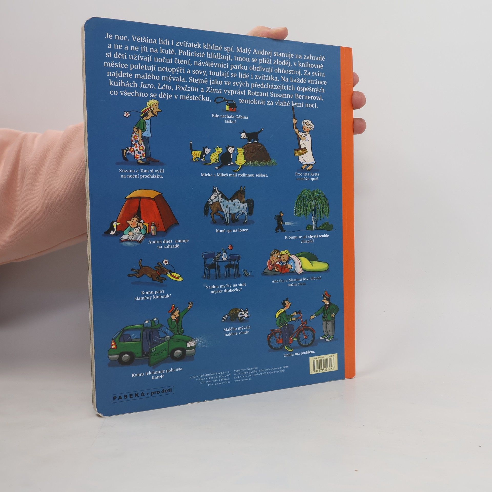 Je noc. Lidé i zvířata klidně spí. Ale ne všichni. Malý Andrej stanuje na zahradě a ne a ne jít na kutě. Policisté hlídkují, v knihovně si děti užívají noční čtení, návštěvníci parku obdivují ohňostroj. Za svitu měsíce poletují netopýři a sovy, toulají se lidé i zvířátka. Na každé stránce najdete malého mývala. A tmou se plíží zloděj… Stejně jako v předcházejících úspěšných knihách Jaro, Léto, Podzim a Zima vypráví Rotraut Susanne Bernerová svými vtipnými obrázky, co všechno se děje v městečku, tentokrát za vlahé letní noci. Knížka podporuje pozorovací schopnosti a podněcuje fantazii, rozvíjí jazyk a rozšiřuje slovní zásobu.