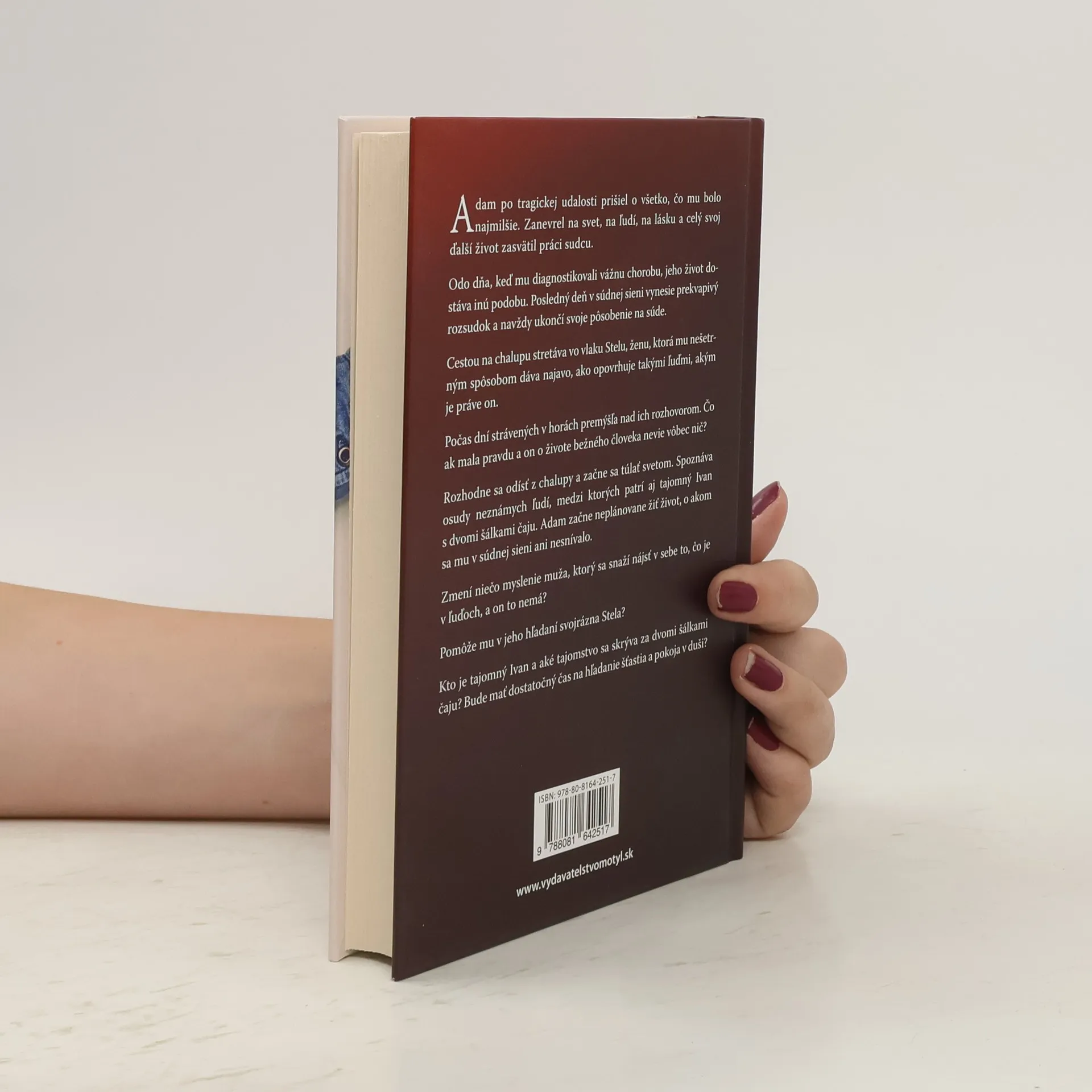 Adam po tragickej udalosti prišiel o všetko, čo mu bolo najmilšie. Zanevrel na svet, na ľudí, na lásku a celý svoj ďalší život zasvätil práci sudcu. Odo dňa, keď mu diagnostikovali vážnu chorobu, jeho život dostáva inú podobu. Posledný deň v súdnej sieni vynesie prekvapivý rozsudok a navždy ukončí svoje pôsobenie na súde. Cestou na chalupu stretáva vo vlaku Stelu, ženu, ktorá mu nešetrným spôsobom dáva najavo, ako opovrhuje takými ľuďmi, akým je práve on. Počas dní strávených v horách premýšľa nad ich rozhovorom. Čo ak mala pravdu a on o živote bežného človeka nevie vôbec nič? Rozhodne sa odísť z chalupy a začne sa túlať svetom. Spoznáva osudy neznámych ľudí, medzi ktorých patrí aj tajomný Ivan s dvomi šálkami čaju. Adam začne neplánovane žiť život, o akom sa mu v súdnej sieni ani nesnívalo. Zmení niečo myslenie muža, ktorý sa snaží nájsť v sebe to, čo je v ľuďoch, a on to nemá? Pomôže mu v jeho hľadaní svojrázna Stela? Kto je tajomný Ivan a aké tajomstvo sa skrýva za dvomi šálkami čaju? Bude mať dostatočný čas na hľadanie šťastia a pokoja v duši?