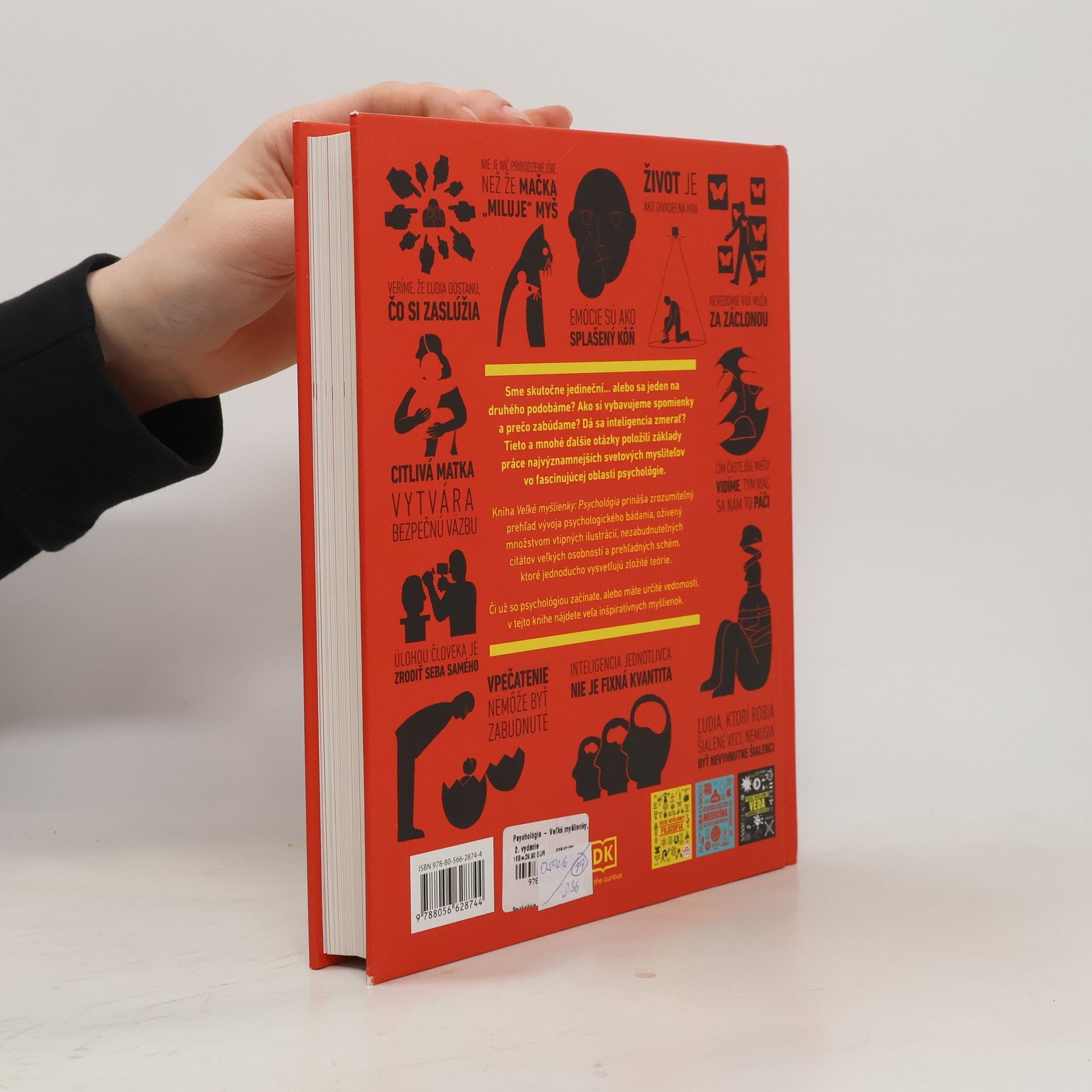 Veľké myšlienky zrozumiteľne podané - pre odborníkov aj pre úplných začiatočníkov. Sme skutočne jedineční… alebo sa jeden na druhého podobáme? Ako si vybavujeme spomienky a prečo zabúdame? Dá sa inteligencia zmerať? Tieto a mnohé ďalšie otázky položili základy práce najvýznamnejších svetových mysliteľov vo fascinujúcej oblasti psychológie. Kniha Veľké myšlienky: Psychológia prináša zrozumiteľný prehľad vývoja psychologického bádania, oživený množstvom vtipných ilustrácií, nezabudnuteľných citátov veľkých osobností a prehľadných schém, ktoré jednoducho vysvetľujú zložité teórie. Či už so psychológiou začínate, alebo máte určité vedomosti, v tejto knihe nájdete množstvo inšpiratívnych myšlienok.
