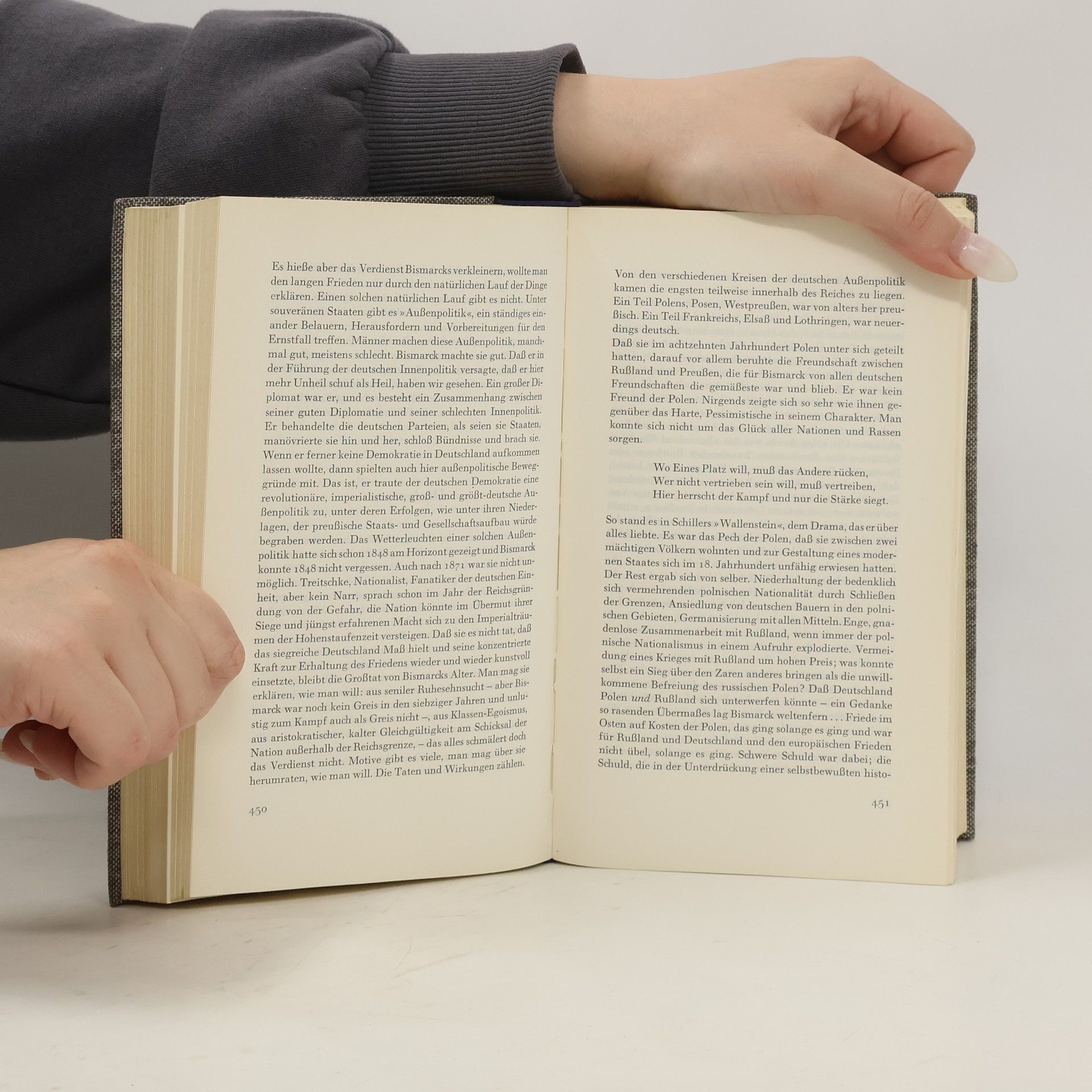»Wer sich in die Geschichte der deutschen Nation vertieft, der hat leicht den Eindruck eines unruhigen Lebens in Extremen ... Einmal erreichen deutsche Gestalten die höchsten geistigen Höhen, auf denen je Menschen gelebt haben, indessen gleichzeitig trübe Mittelmäßigkeit den öffentlichen Ton beherrscht. Von apolitischer Ruhe wendet Deutschland sich zur aufgeregtesten politischen Tätigkeit, von buntscheckiger Vielgestalt zu radikaler Einheitlichkeit; aus Ohnmacht erhebt es sich zu aggressiver Macht, sinkt zurück in Ruin, erarbeitet sich in unglaublicher Schnelle neuen, hektischen Wohlstand. Es ist weltoffen, kosmopolitisch, mit Bewunderung dem Fremden zugeneigt; dann verachtet und verjagt es das Fremde und sucht das Heil in übersteigerter Pflege seiner Eigenart. Die Deutschen gelten als das philosophische, spekulative Volk, dann wieder als das am stärksten praktische, materialistische, als das geduldigste, friedlichste, und wieder als das herrschsüchtigste, brutalste. Ihr eigener Philosoph, Nietzsche, hat sie das 'Täusche-Volk' genannt, weil sie die Welt immer wieder mit Dingen überraschen, die man gerade von ihnen nicht erwartet.« Golo Mann