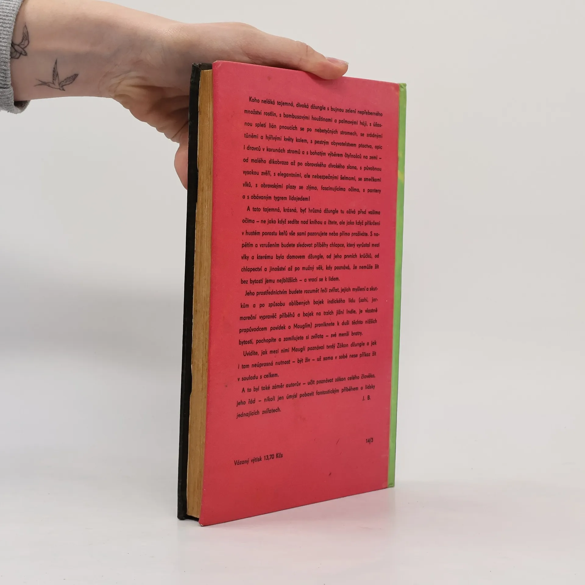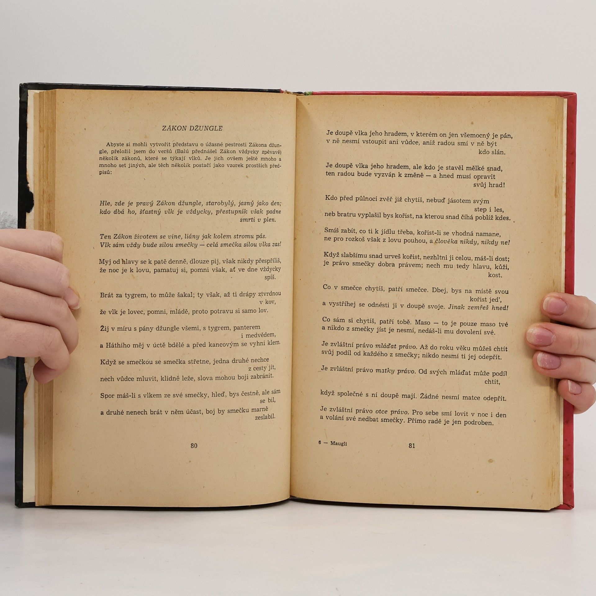 Povídky z džungle. Příběh Mauglího. Dejištěm povídek o Mauglím jsou překrásné, rozlehlé džungle v jižní části střední Indie-v provincii Madhjapradéš. Město Séóní leží při silnici, jež spojuje Džabalpur a Nágpur, zhruba uprostřed vzdálenosti mezi nimi. Séóníský okres je skorocelý pokryt hlubokými hustými lesy, kde žije ve velikých množstvích rozmanitá divoká zvěř. V těchto džunglích, které patří k nejkrásnějším v celé Indii, loví obyvatelstvo jednak zvěř, jednak se živí těžbou bambusu nebo tvrdého, načervenalého těkového dřeva, výborného na stavbu lodí. Séóníským okresem se vine horní tok řeky Vajngangy, jež dosahuje šíře až 270 m a jejíž celková délka od pramene po soutok s Gódávarou činí 560 km. Kapitoly: Mauglího bratři-Lovecká píseň séóníské smečky, Ká loví-Pochod Bandarů, Jak se zrodil Strach-Zákon džungle, "Tygr ! Tygr !-Mauglího píseň, Vpád džungle-Mauglího zpěv proti lidem, Králův ankus-Píseň malého lovce, Rezavý pes-Čílův zpěv, Jarní běh-Zpěv na rozloučenou. První vydání v SNDK. Cena knihy v čase vydání: 21,75 Kčs.