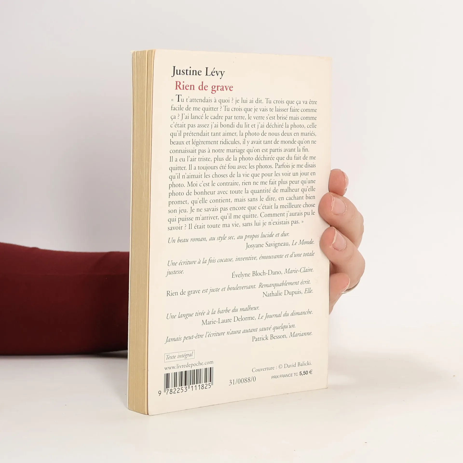 " Tu t'attendais à quoi ? Je lui ai dit. Tu crois que ça va être facile de me quitter ? Tu crois que je vais te laisser faire comme ça ? J'ai lancé le cadre par terre, le verre s'est brisé mais comme c'était pas assez, j'ai bondi du lit et j'ai déchiré la photo, celle qu'il prétendait tant aimer, la photo de nous deux en mariés, beaux et légèrement ridicules, il y avait tant de monde qu'on ne connaissait pas à notre mariage qu'on est partis avant la fin. Il a eu l'air triste, plus de la photo déchirée que du fait de me quitter. Il a toujours été fou avec les photos. Parfois je me disais qu'il n'aimait les choses de la vie que pour les voir un jour en photo. Moi c'est le contraire, rien ne me fait plus peur qu'une photo de bonheur avec toute la quantité de malheur qu'elle promet, qu'elle contient, mais sans le dire, en cachant bien son jeu. Je ne savais pas encore que c'était la meilleure chose qui puisse m'arriver, qu'il me quitte. Comment j'aurais pu le savoir ? Il était toute ma vie, sans lui je n'existais pas. "