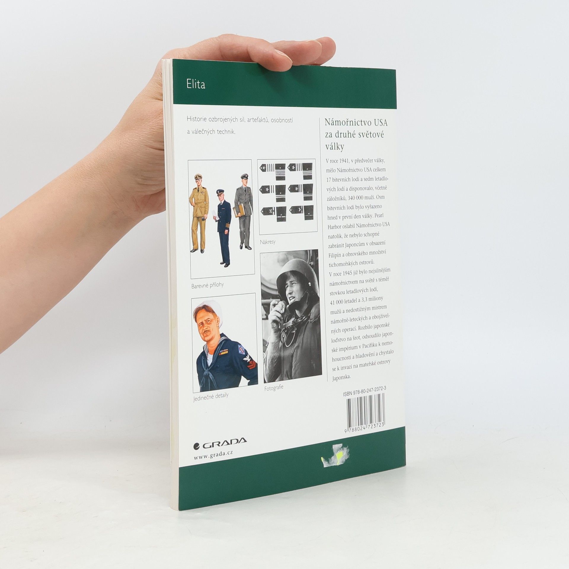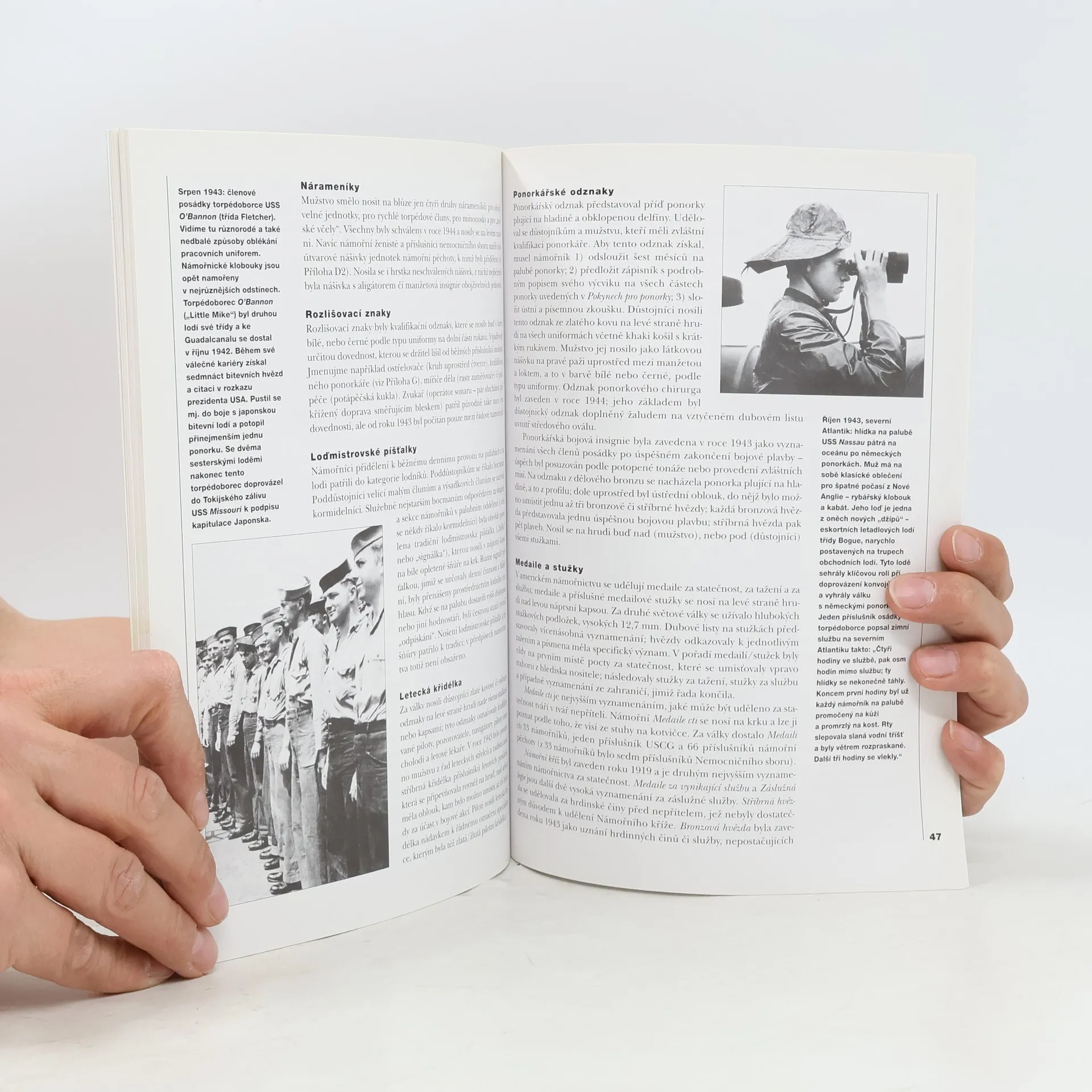 Úvod obsahuje přehled významných vojenských operací amerického námořnictva v průběhu let 1941-1945. V následujících kapitolách publikace popisuje druhy plavidel užívaných během světové války (bitevní a letadlové lodě, torpédoborce, ponorky) a seznamuje s organizační strukturou amerického námořnictva. Přibližuje též každodenní život a službu námořníků. Nechybí ani kapitoly popisující uniformy mužstva i důstojnictva. Množství barevných obrazových příloh a dobových černobílých fotografií. Vylíčení vzestupu Námořnictva USA v nejsilnější námořnictvo na světě, k němuž došlo pod tlakem agrese Japonska v Tichomoří během pár let, od přepadení Pearlu Harboru v roce 1941 do jara 1945. ...