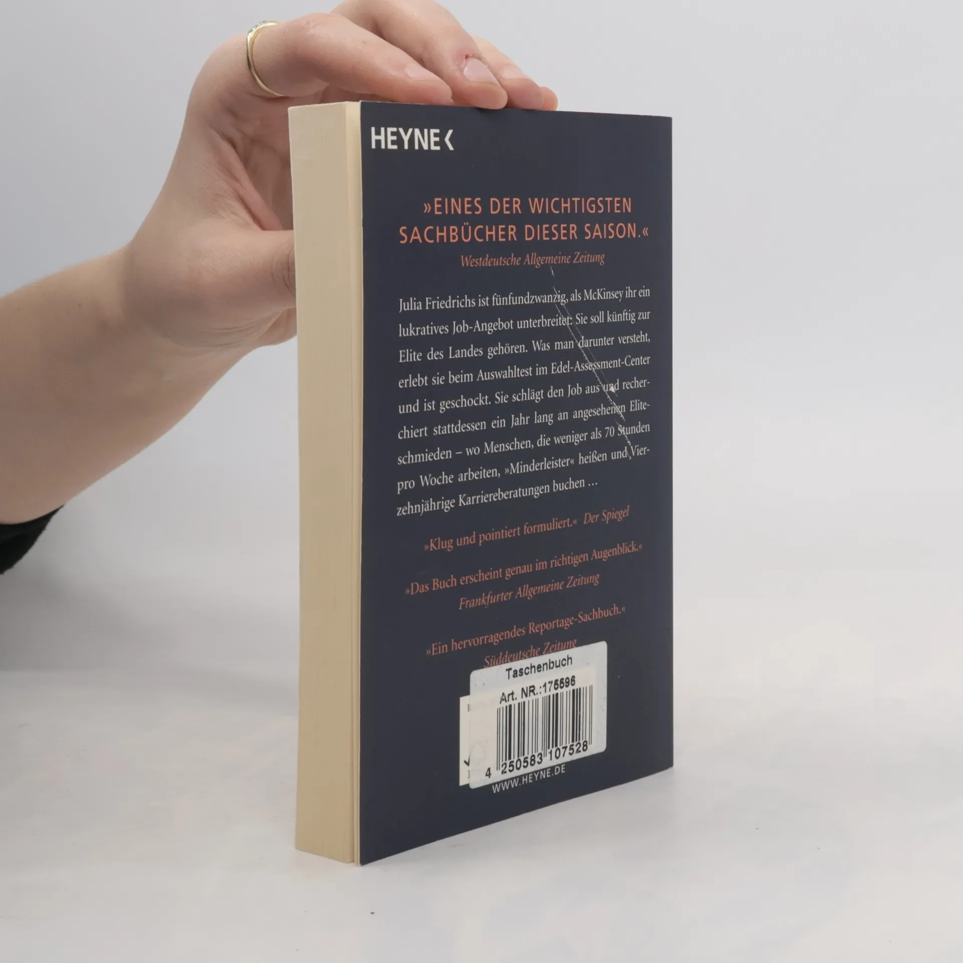 Ein höchst aufschlussreicher Einblick in Deutschlands angesehendste Eliteschmieden Julia Friedrichs ist fünfundzwanzig, als McKinsey ihr ein lukratives Job-Angebot macht: Sie soll künftig zur Elite des Landes gehören. Was man darunter versteht, erlebt sie beim Auswahltest im Edel-Assessment-Center – und ist schockiert. Sie schlägt den Job aus und recherchiert stattdessen ein Jahr lang an angesehenen Eliteschmieden – wo Menschen, die weniger als 70 Stunden pro Woche arbeiten, „Minderleister“ heißen und Vierzehnjährige Karriereberatungen buchen …