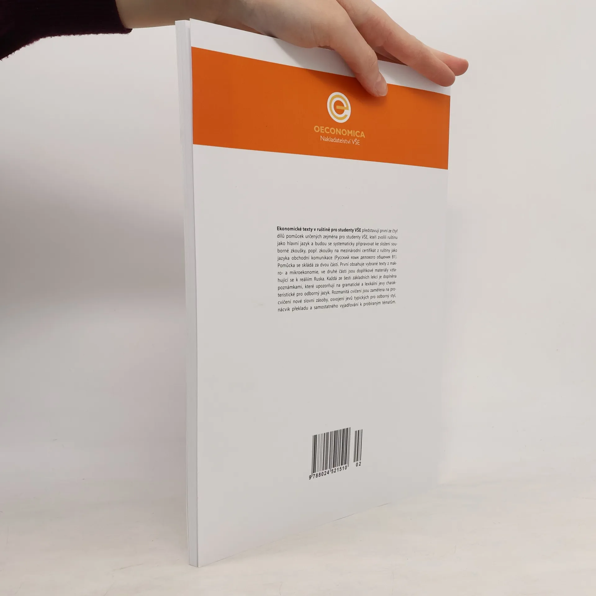 Ekonomické texty v ruštině pro studenty VŠE představují první ze čtyř dílů pomůcek určených zejména pro studenty VŠE, kteří zvolili ruštinu jako hlavní jazyk a budou se systematicky připravovat ke složení souborné zkoušky, popř. zkoušky na mezinárodní certifikát z ruštiny jako jazyka obchodní komunikace (Р.,у.,с.,с.,к.,и.,й., я.,з.,ы.,к., д.,е.,л.,о.,в.,о.,г.,о., о.,б.,щ.,е.,н.,и.,я., В.,1). Pomůcka se skládá za dvou částí. První obsahuje vybrané texty z makro- a mikroekonomie, ve druhé části jsou doplňkové materiály vztahující se k reáliím Ruska. Každá ze šesti základních lekcí je doplněna poznámkami, které upozorňují na gramatické a lexikální jevy charakteristické pro odborný jazyk. Rozmanitá cvičení jsou zaměřena na procvičení nové slovní zásoby, osvojení jevů typických pro odborný styl, nácvik překladu a samostatného vyjadřování k probíraným tématům.