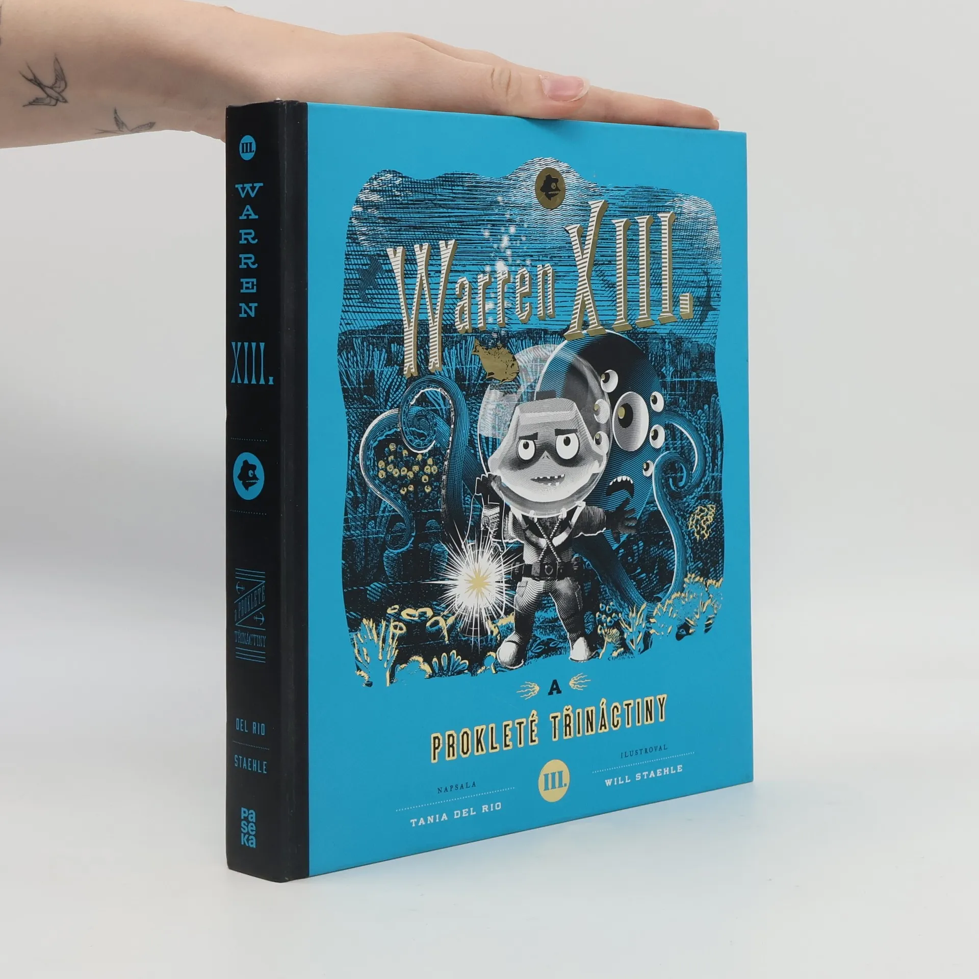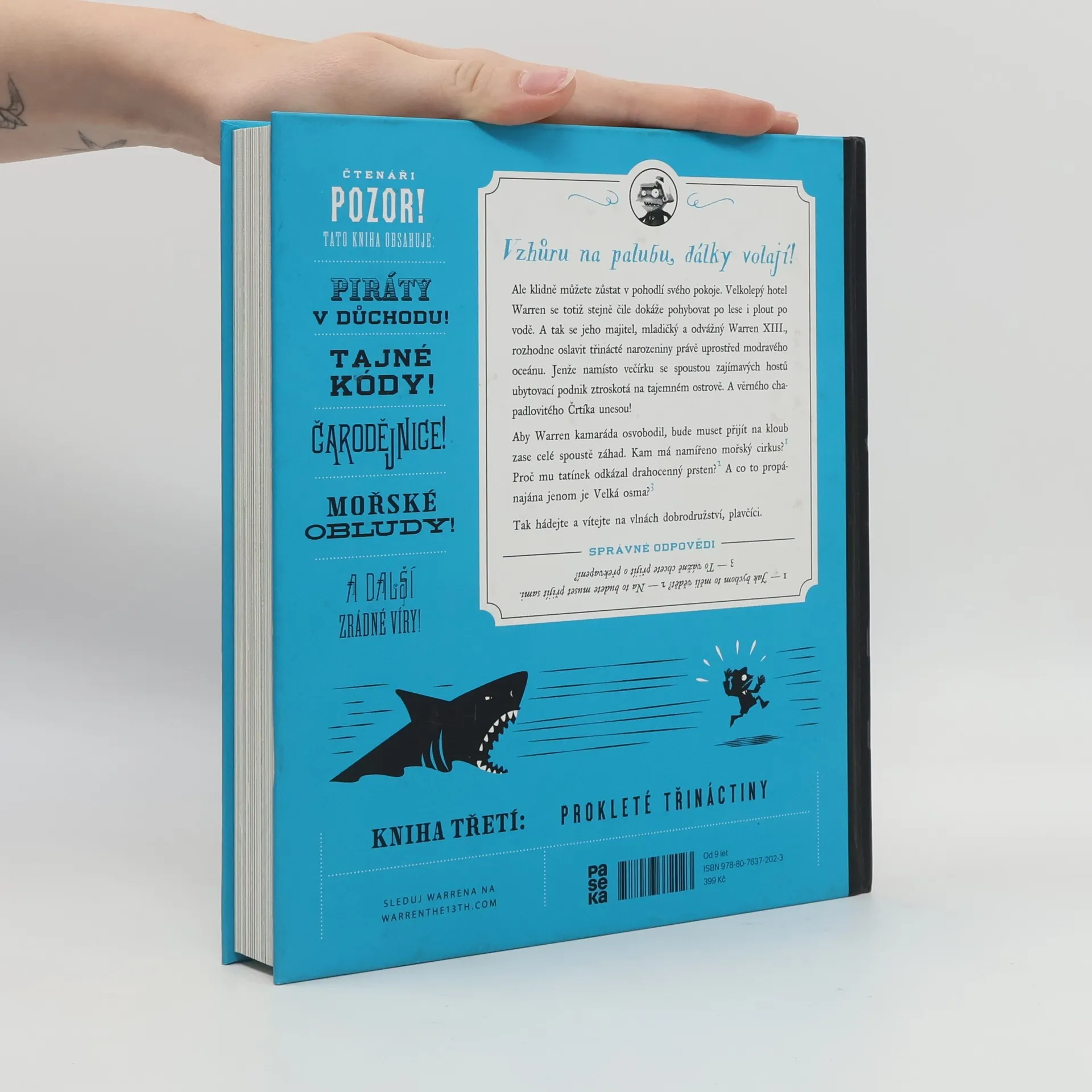 Vzhůru na palubu, dálky volají! Ale klidně můžete zůstat v pohodlí svého pokoje. Velkolepý hotel Warren se totiž stejně čile dokáže pohybovat po lese i plout po vodě. A tak se jeho majitel, mladičký Warren XIII., rozhodně oslavit třinácté narozeniny právě uprostřed modravého oceánu. Jenže namísto večírku se spoustou zajímavých hostů ubytovací podnik ztroskotá na tajemném ostrově. A věrného chapadlovitého kamaráda Črtíka unesou! V závěrečném díle této jedinečné série Warren pozná, co to je pořádná námořní výprava. A kromě nám již známých kumpánů se setká nejen s hordou pirátů, ale i s mořskou čarodějnicí nebo s mluvící škeblí. Vítejte na vlnách dobrodružství, plavčíci.