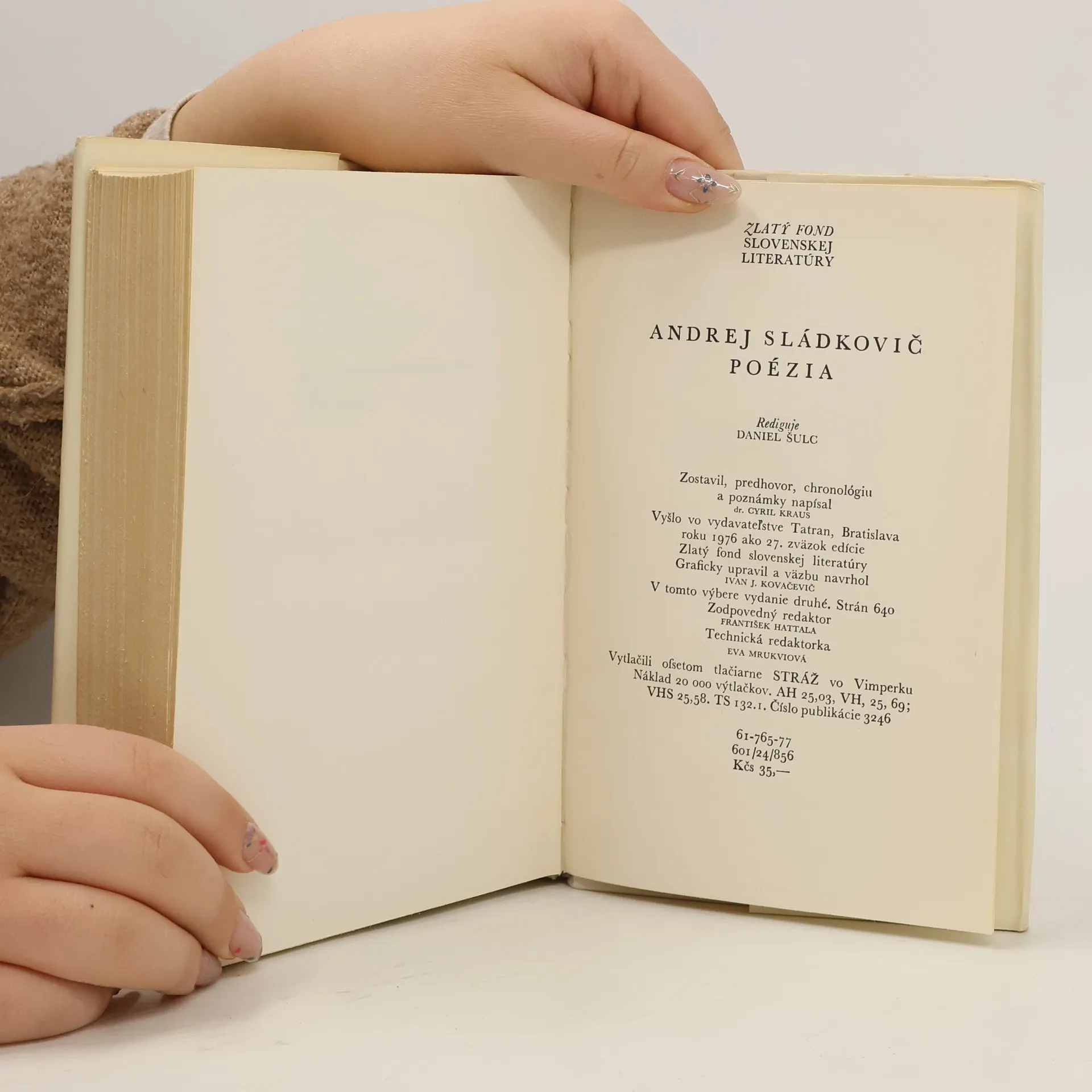 Výber z poézie, ktorý vychádza z dvojzväzkového vydania "Dielo", ktoré vyšlo v SVKL v roku 1961. V tomto výbere druhé vydanie. Zostavil, úvodnú štúdiu "Básnik a jeho dielo", "Chronológiu Sládkovičovho života a diela" a poznámky napísal Cyril Kraus.