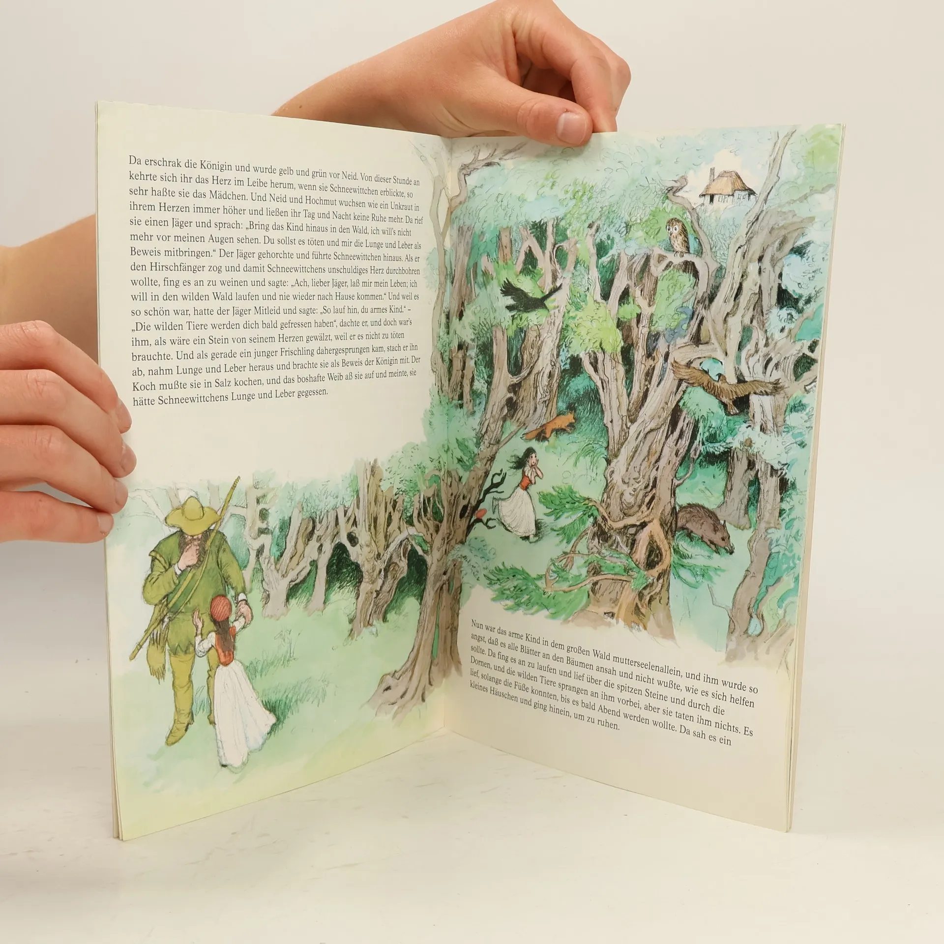 Schneewittchens Mutter ist bei der Geburt gestorben; die Stiefmutter ist eine stolze, böse Frau. Als der sprechende Spiegel ihr verkündet, Schneewittchen sei schöner als sie, befiehlt sie einem Jäger, das Mädchen zu töten. Dieser lässt es aber entkommen und es findet bei den sieben Zwergen eine neue Heimat. Doch die böse Königin erfährt davon durch ihren Spiegel und versucht dreimal, das Mädchen zu töten, das dritte Mal mit einem vergifteten Apfel. Jetzt halten die Zwerge es tatsächlich für tot und legen es in einen gläsernen Sarg. Ein vorüberreitender Prinz verliebt sich in Schneewittchen und will es mitnehmen.