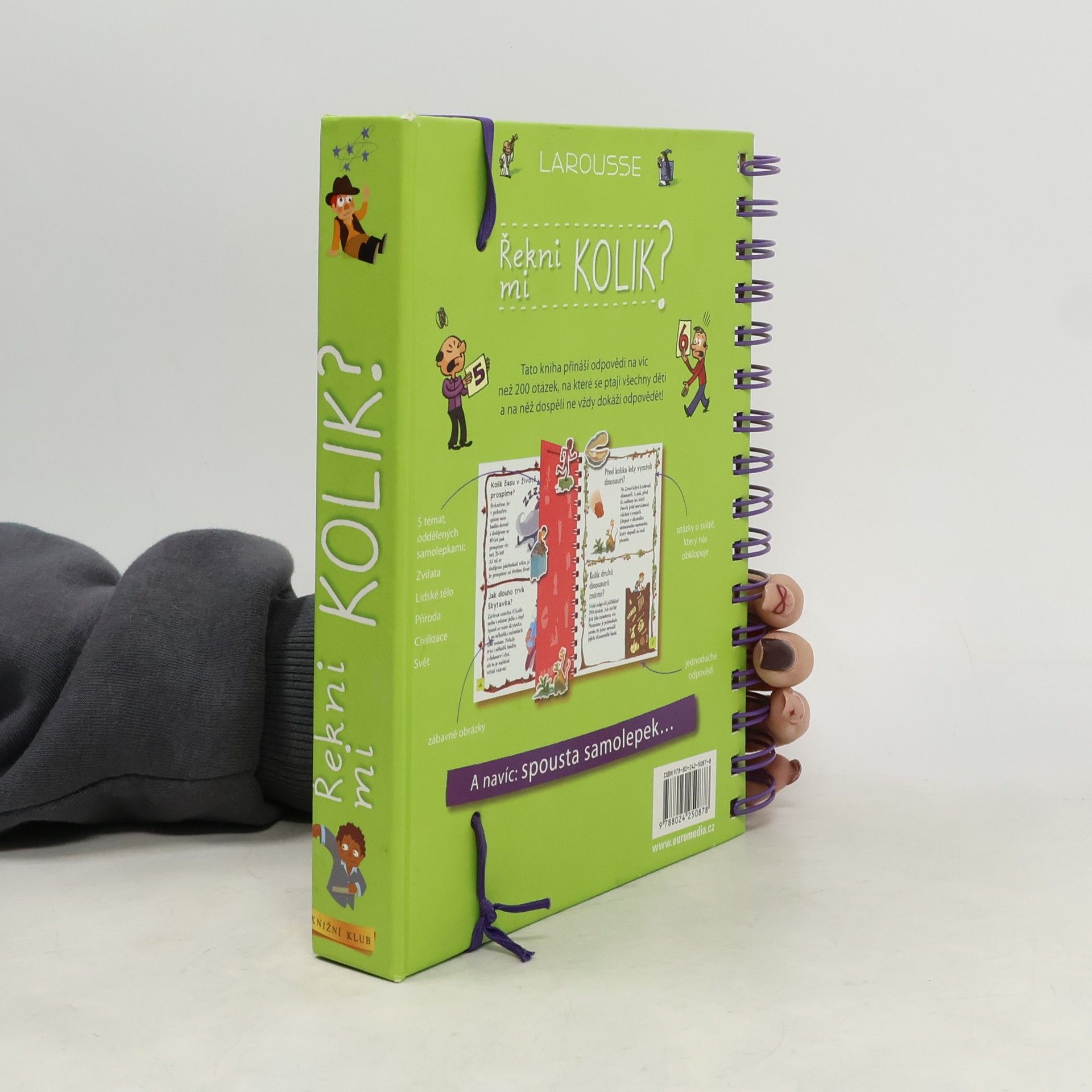 Další ze série oblíbených encyklopedií pro zvídavé děti odpovídá na 212 všetečných otázek – tentokrát na téma „kolik čeho je“. Kolik máme zubů? Kolik let je Země na světě? Kolik teček má beruška na krovkách? Otázky i odpovědi jsou rozdělené na pět oblastí: zvířata, lidské tělo, přírodní svět, civilizace a Země. V knížce s praktickou spirálovou vazbou jako obvykle nechybí ani samolepky a půvabné ilustrace.