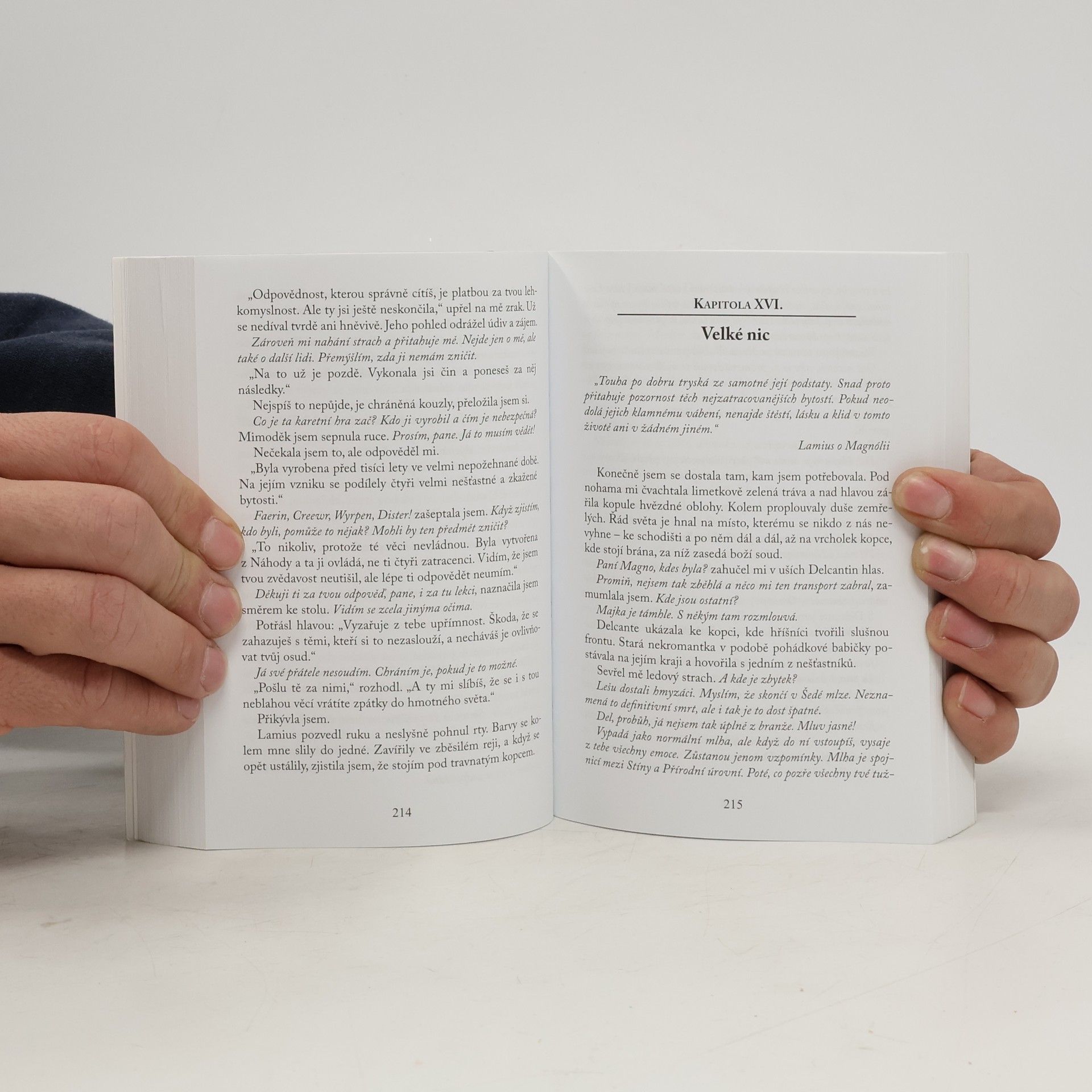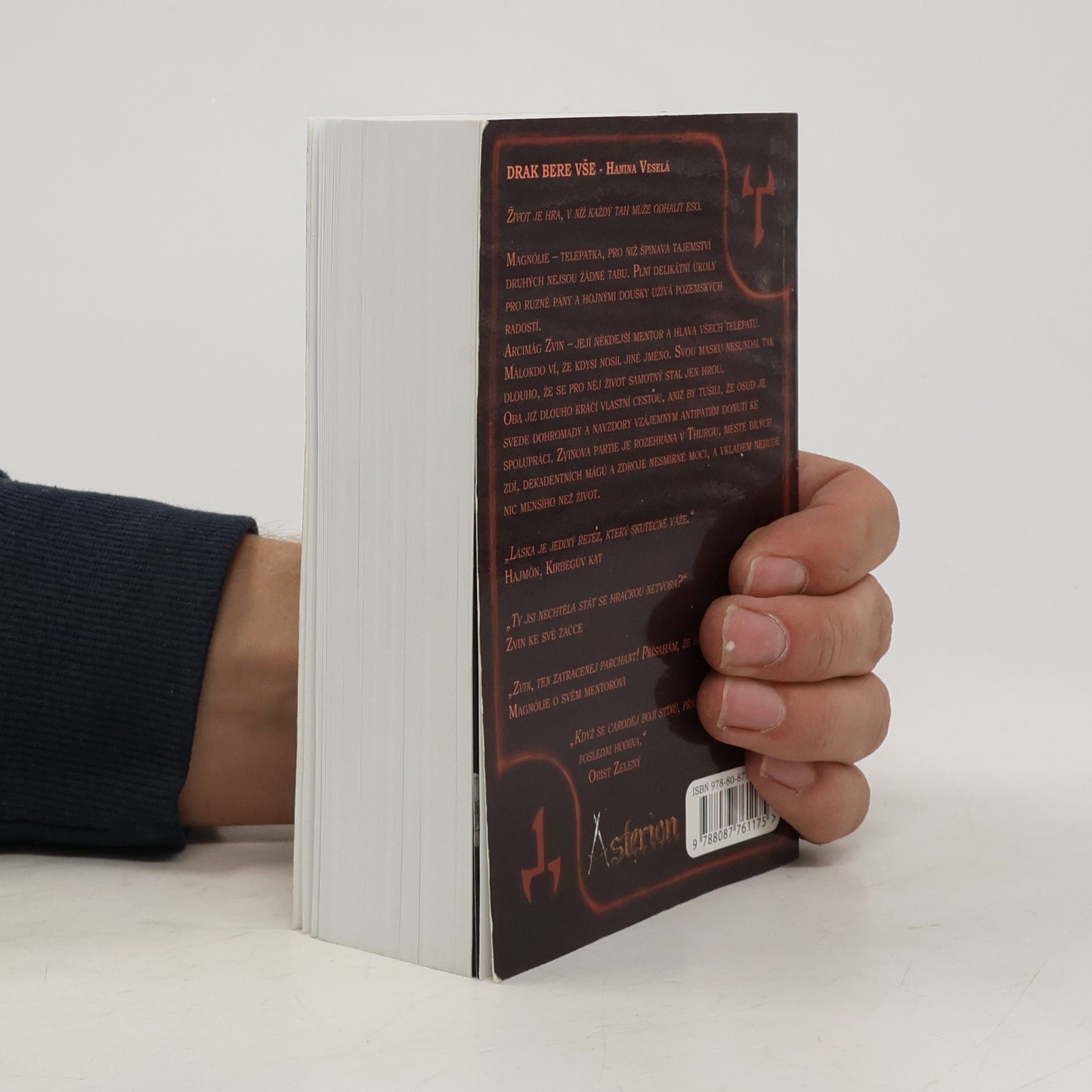 Magnólie – telepatka, pro niž špinavá tajemství druhých nejsou žádné tabu. Plní delikátní úkoly pro různé pány a hojnými doušky užívá pozemských radostí. Arcimág Zvin – její někdejší mentor a hlava všech telepatů. Málokdo ví, že kdysi nosil jiné jméno. Svou masku nesundal tak dlouho, že se pro něj život samotný stal jen hrou. Oba již dlouho kráčí vlastní cestou, aniž by tušili, že osud je svede dohromady a navzdory vzájemným antipatiím donutí ke spolupráci. Zvinova partie je rozehrána v Thurgu, městě bílých zdí, dekadentních mágů a zdroje nesmírné moci, a vkladem nebude nic menšího než život. „Láska je jediný řetěz, který skutečně váže.“ Hajmón, Kirbegův kat „Ty jsi nechtěla stát se hračkou netvora?“ Zvin ke své žačce „Zvin, ten zatracenej parchant! Přísahám, že ho zabiju!“ Magnólie o svém mentorovi „Když se čaroděj bojí stínů, přichází jeho poslední hodina.“ Orist Zelený