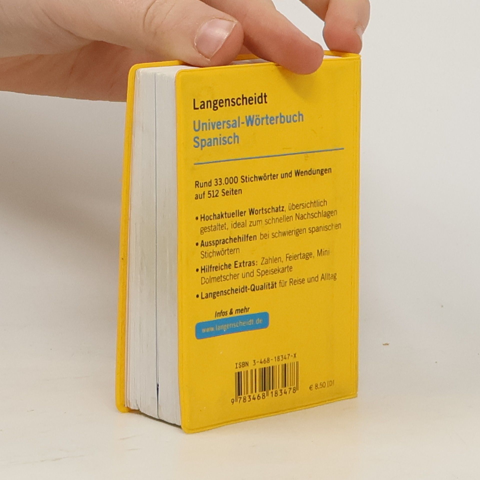 Das universelle Wörterbuch mit aktuellem Wortschatz im besonders praktischen Format. Rund 33.000 Stichwörter und Wendungen alle Haupteinträge in Blau für die schnelle Orientierung hilfreiche Extras im Anhang: Feiertage, Mini-Dolmetscher zu wichtigen Sprechsituationen auf der Reise, spanische Speisekarte u. a. zum schnellen Nachschlagen auf Reisen und für den fremdsprachlichen Anfangsunterricht