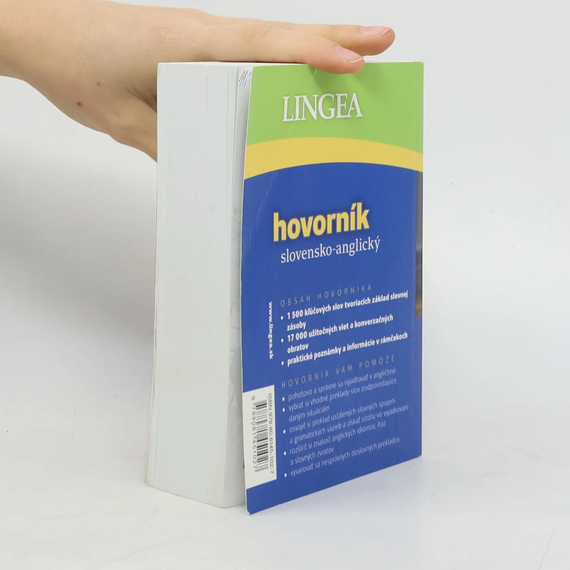 OBSAH HOVORNÍKA· 1 500 kľúčových slov tvoriacich základ slovnej zásoby· 17 000 užitočných viet a konverzačných obratov· praktické poznámky a informácie v rámčekochHOVORNÍK VÁM POMÔŽE:· pohotovo a správne sa vyjadrovať v angličtine· vybrať si vhodné preklady slov zodpovedajúce daným situáciám· osvojiť si preklad ustálených slovných spojení a gramatických väzieb a získať istotu vo vyjadrovaní· rozšíriť si znalosť anglických idiómov, fráz a slovných zvratov· vyvarovať sa nesprávnych doslovných prekladov