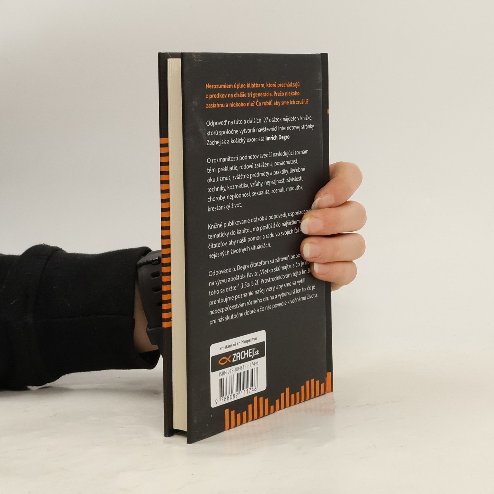 Nerozumiem celkom kliatbam, ktoré prechádzajú z predkov na ďalšie tri generácie. Prečo niekoho zasiahnu a niekoho nie? Čo robiť, aby sme ich zrušili? Odpoveď na túto a ďalších 127 otázok nájdete v knižke, ktorú spoločne vytvorili návštevníci internetovej stránky Zachej.sk a košický exorcista Imrich Degro. O rozmanitosti podnetov svedčí nasledujúci zoznam tém: prekliatie, rodové zaťaženia, posadnutosť, okultizmus, zvláštne predmety a praktiky, liečebné techniky, kozmetika, vzťahy, neprajnosť, závislosti, choroby, neplodnosť, sexualita, zosnulí, modlitba, kresťanský život. Knižné publikovanie otázok a odpovedí, usporiadaných tematicky do kapitol, má poslúžiť čo najširšiemu okruhu čitateľov, aby našli pomoc a radu vo svojich ťažkých či nejasných životných situáciách. Odpovede o. Degra čitateľom sú zároveň odpoveďou na výzvu apoštola Pavla: „Všetko skúmajte, a čo je dobré, toho sa držte!“ (1 Sol 5,21) Prostredníctvom tejto knižky prehlbujme poznanie našej viery, aby sme sa vyhli nebezpečenstvám rôzneho druhu a vyberali si len to, čo je pre nás skutočne dobré a čo nás povedie k večnému životu. Kniha je cirkevne schválená.