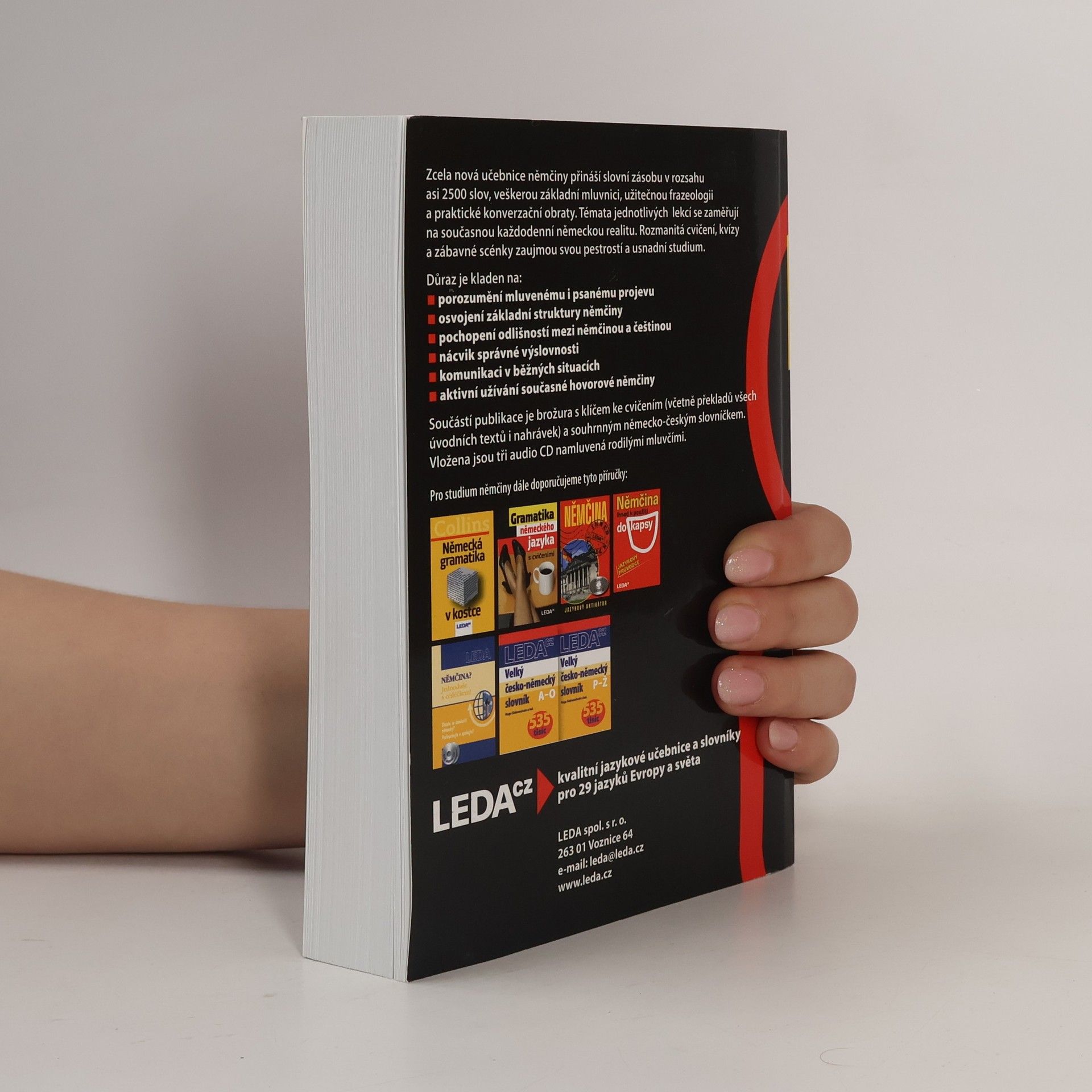 Zcela nová učebnice němčiny přináší slovní zásobu v rozsahu asi 2500 slov, veškerou základní mluvnici, užitečnou frazeologii a praktické konverzační obraty. Témata jednotlivých lekcí reflektují současný každodenní život se zaměřením na německou realitu. Rozmanitá cvičení, kvízy a zábavné scénky zaujmou svou pestrostí a usnadní studium. Důraz je kladen na: - porozumění mluvenému i psanému projevu - osvojení základní struktury němčiny - pochopení odlišností mezi němčinou a češtinou - nácvik správné výslovnosti - zvládnutí komunikace v běžných situacích - aktivní užívání současné hovorové němčiny Součástí publikace je brožura s klíčem ke cvičením (včetně překladů všech úvodních textů i nahrávek) a souhrnným německo-českým slovníčkem. Vložena jsou tři audio CD namluvená rodilými mluvčími. Učebnice je vhodná jak pro samouky, tak pro studium pod vedením učitele. Určena je pro uživatele se vstupní úrovní A1 až B1 (začátečník až mírně pokročilý), dosáhnout lze stupně pokročilosti B1 až C1 (mírně pokročilý až pokročilý).