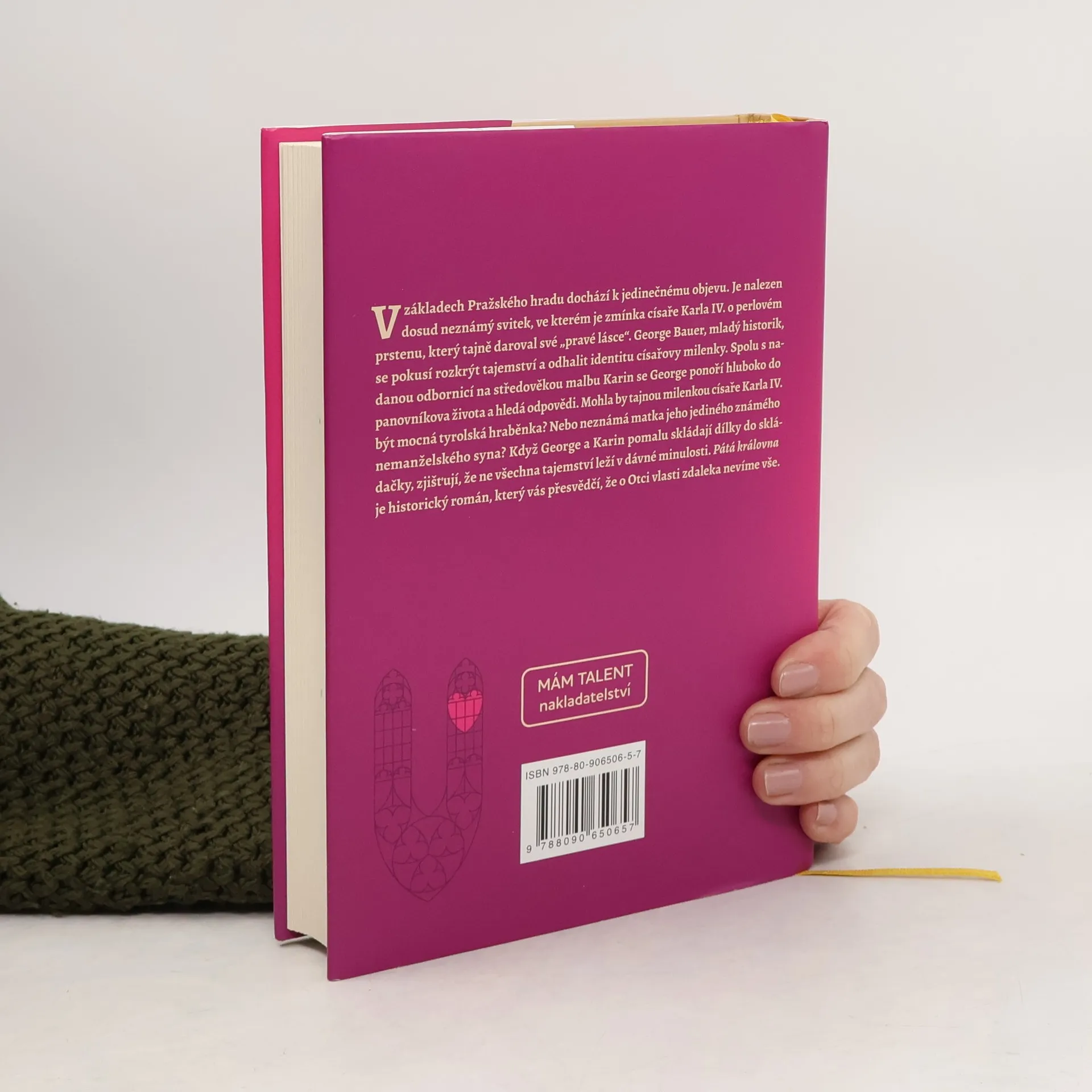 V základech Pražského hradu dochází k jedinečnému objevu. Je nalezen dosud neznámý svitek, ve kterém je zmínka císaře Karla IV. o perlovém prstenu, který tajně daroval své „pravé lásce“. George Bauer, mladý historik, se pokusí rozkrýt tajemství a odhalit identitu císařovy milenky. Spolu s nadanou odbornicí na středověkou malbu Karin se George ponoří hluboko do panovníkova života a hledá odpovědi. Mohla by tajnou milenkou císaře Karla IV. být mocná tyrolská hraběnka? Nebo neznámá matka jeho jediného známého nemanželského syna? Když George a Karin pomalu skládají dílky do skládačky, zjišťují, že ne všechna tajemství leží v dávné minulosti. Pátá královna je historický román, který vás přesvědčí, že o Otci vlasti zdaleka nevíme vše