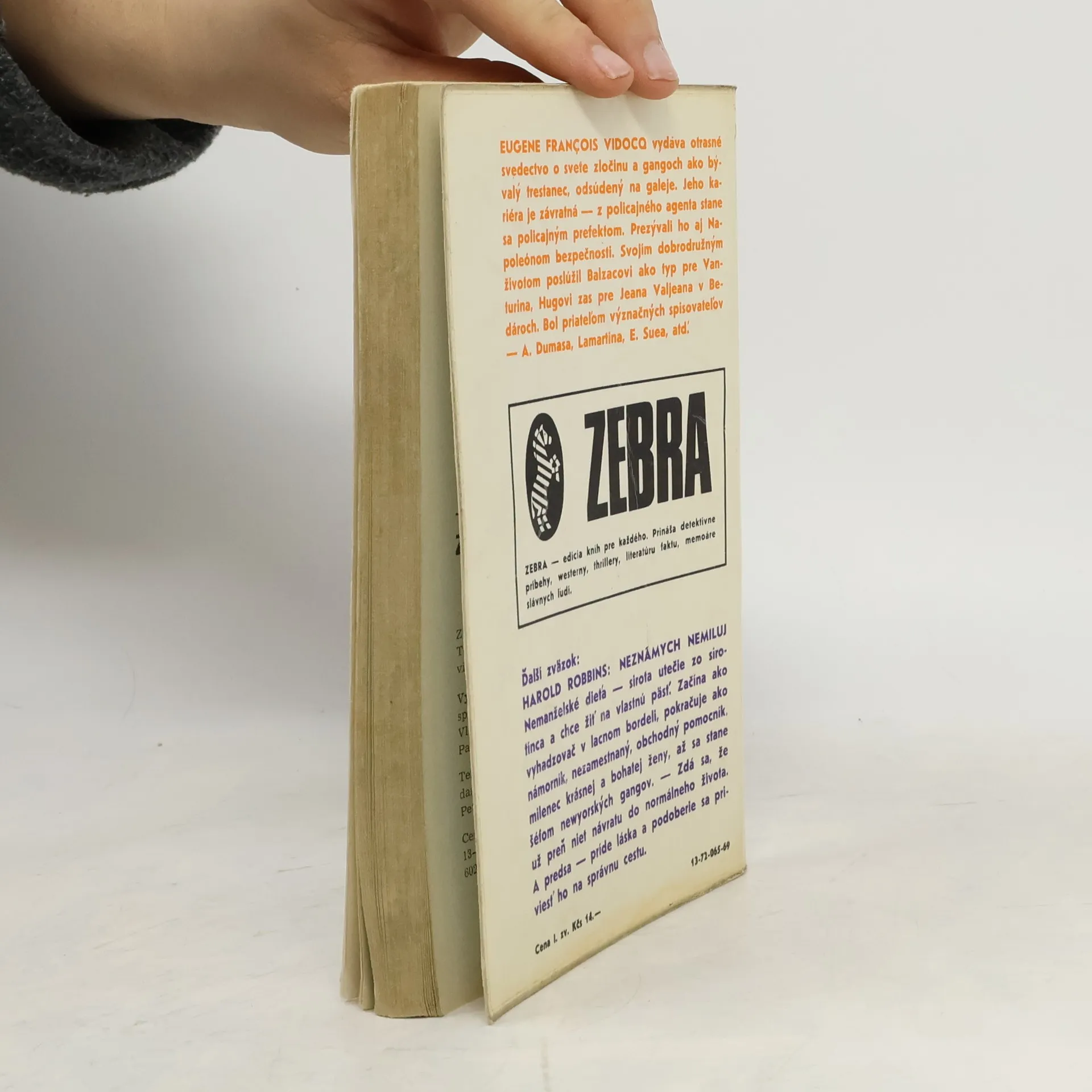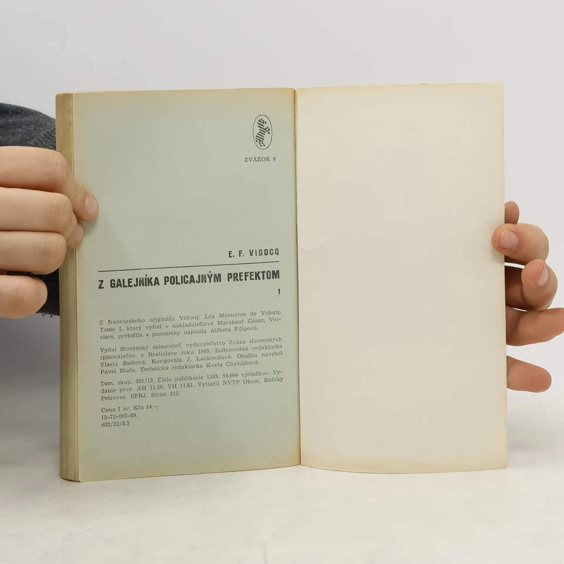 E. F. VIDOCQ vydáva otrasné svedectvo o svete zločinu a gangoch ako bývalý trestanec, odsúdený na galeje. Jeho kariéra je závratná – z policajného agenta stane sa policajným prefektom. Prezývali ho aj Napoleónom bezpečnosti. Svojim dobrodružným životom poslúžil Balzacovi ako typ pre Vanturina, Hugovi zas pre Jeana Valjeana v Bedároch. Bol priateľom význačných spisovateľov - A. Dumasa, Lamartina. Vyšlo v letech 1969–1970 postupně v 4 svazcích: sv. 1. 1969. 211 s. – – sv. 2. 1969. 276 s. – – sv. 3. 1970. 210 s. – – sv. 4. 1970. 173 s. s takřka identickými obálkami.