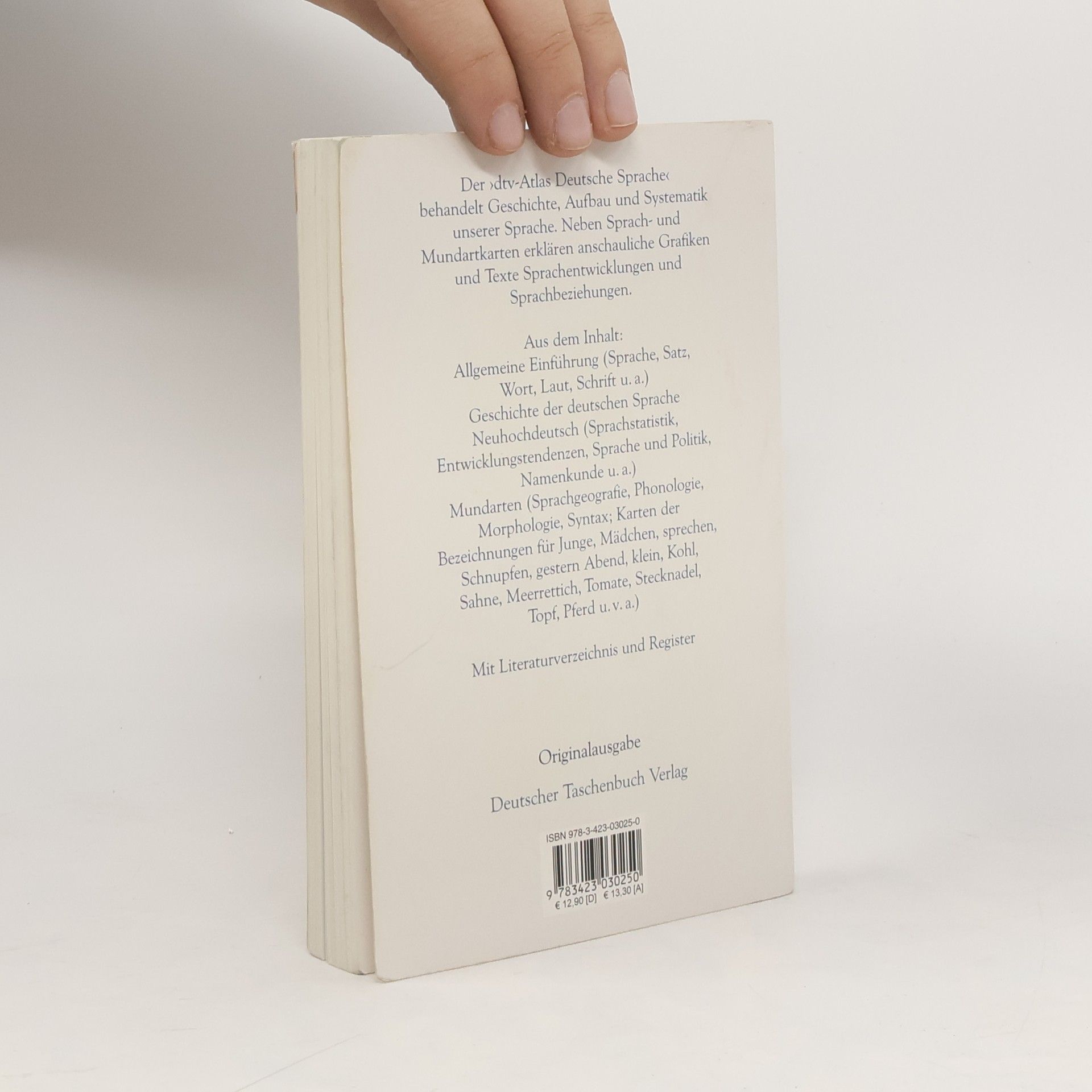 Mit 155 farbigen AbbildungsseitenGrafiker: Hans-Joachim Paul und Werner Wildermuth Der ›dtv-Atlas Deutsche Sprache‹ behandelt Geschichte, Aufbau und Systematik unserer Sprache. In einer übersichtlichen Einführung erläutert er Grundsätzliches zu Sprache, Wort, Lautbildung und Schrift. Zusätzlich zeichnet der Text mit Hilfe zahlreicher Grafiken die Sprachentwicklung vom Indogermanischen bis zum Neuhochdeutschen nach und verdeutlicht die verschiedenen Sprachbeziehungen. Damit ist der Atlas nicht nur ein kompetentes Grundlagenwerk für Sprachwissenschaftler und alle an der deutschen Sprachgeschichte und -entwicklung interessierten Leser. Auch jene Menschen, die sich z. B. nach einem Umzug beim Bestellen des Handwerkers oder beim Einkauf in der Bäckerei nicht verstanden fühlen, finden in den Mundartkarten die regional jeweils »richtige« Bezeichnung für z. B. »Klempner« oder »Brötchen«. Aus dem Inhalt: Allgemeine Einführung (Sprache, Satz, Wort, Laut, Schrift u. a.). Geschichte der deutschen Sprache. Neuhochdeutsch (Sprachstatistik, Entwicklungstendenzen, Sprache und Politik, Namenkunde u. a.). Mundarten (Sprachgeographie, Phonologie, Morphologie, Syntax; Karten der Bezeichnungen für z. B. Junge, Mädchen, Schwiegertochter, Schnupfen, gestern, Sahne, Tomate, Gurke, Topf, Pferd). Umgangssprachen (Karten der Bezeichnungen für z. B. Brötchen, zwicken) Mit Literaturverzeichnis und Register