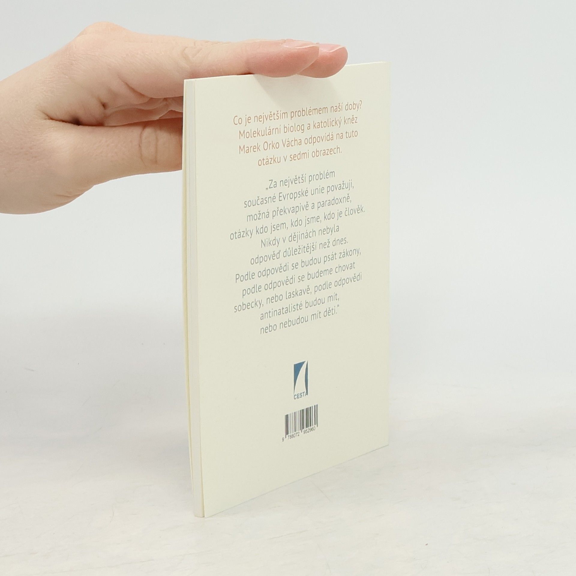 Co je největším problémem naší doby? Molekulární biolog a katolický kněz Marek Orko Vácha odpovídá na tuto otázku v sedmi obrazech. "Za největší problém současné Evropské unie považuji, možná překvapivě a paradoxně, otázky kdo jsem, kdo jsme, kdo je člověk. Nikdy v dějinách nebyla odpověď důležitější než dnes. Podle odpovědi se budou psát zákony, podle odpovědi se budeme chovat sobecky, nebo laskavě, podle odpovědi antinatalisté budou mít, nebo nebudou mít děti," píše.