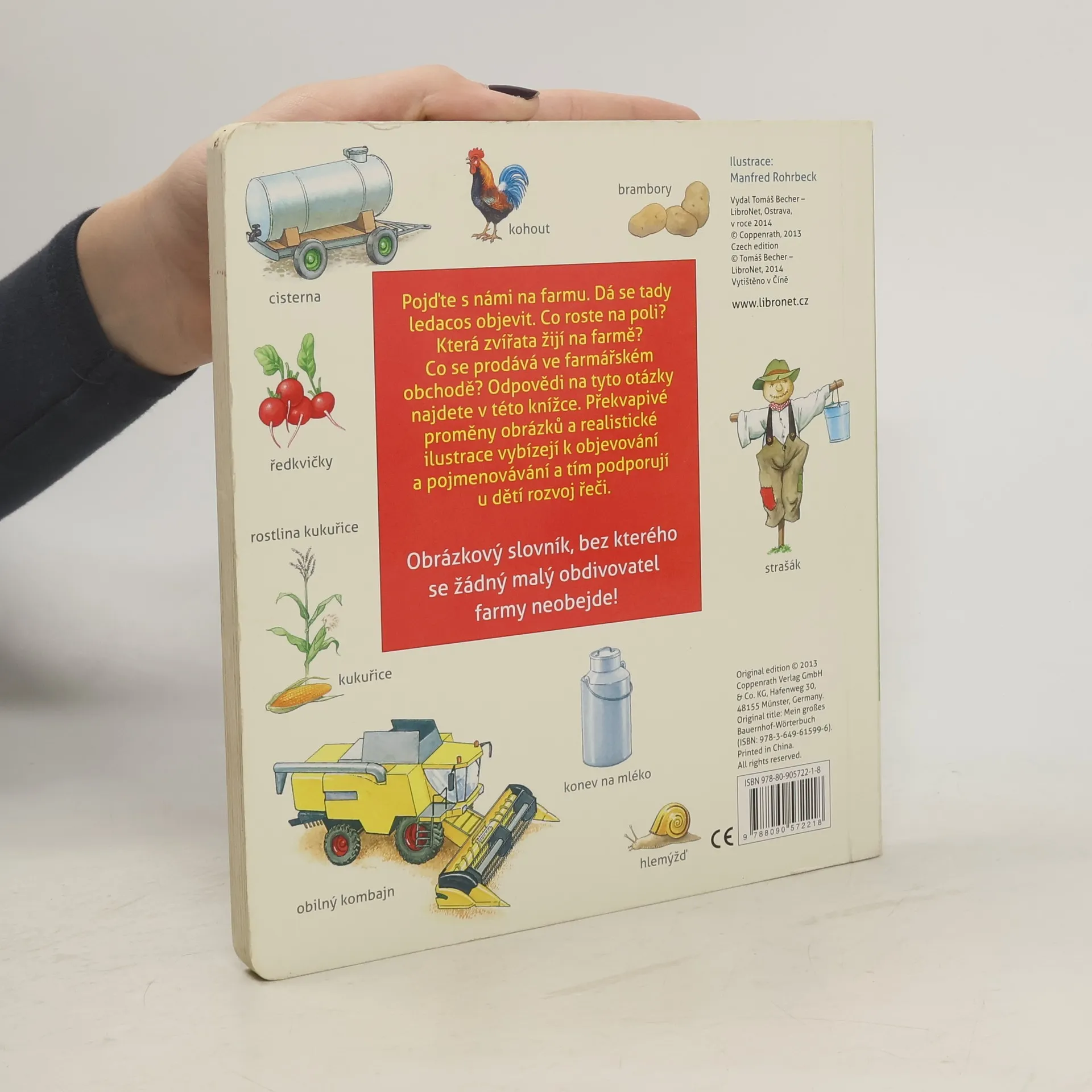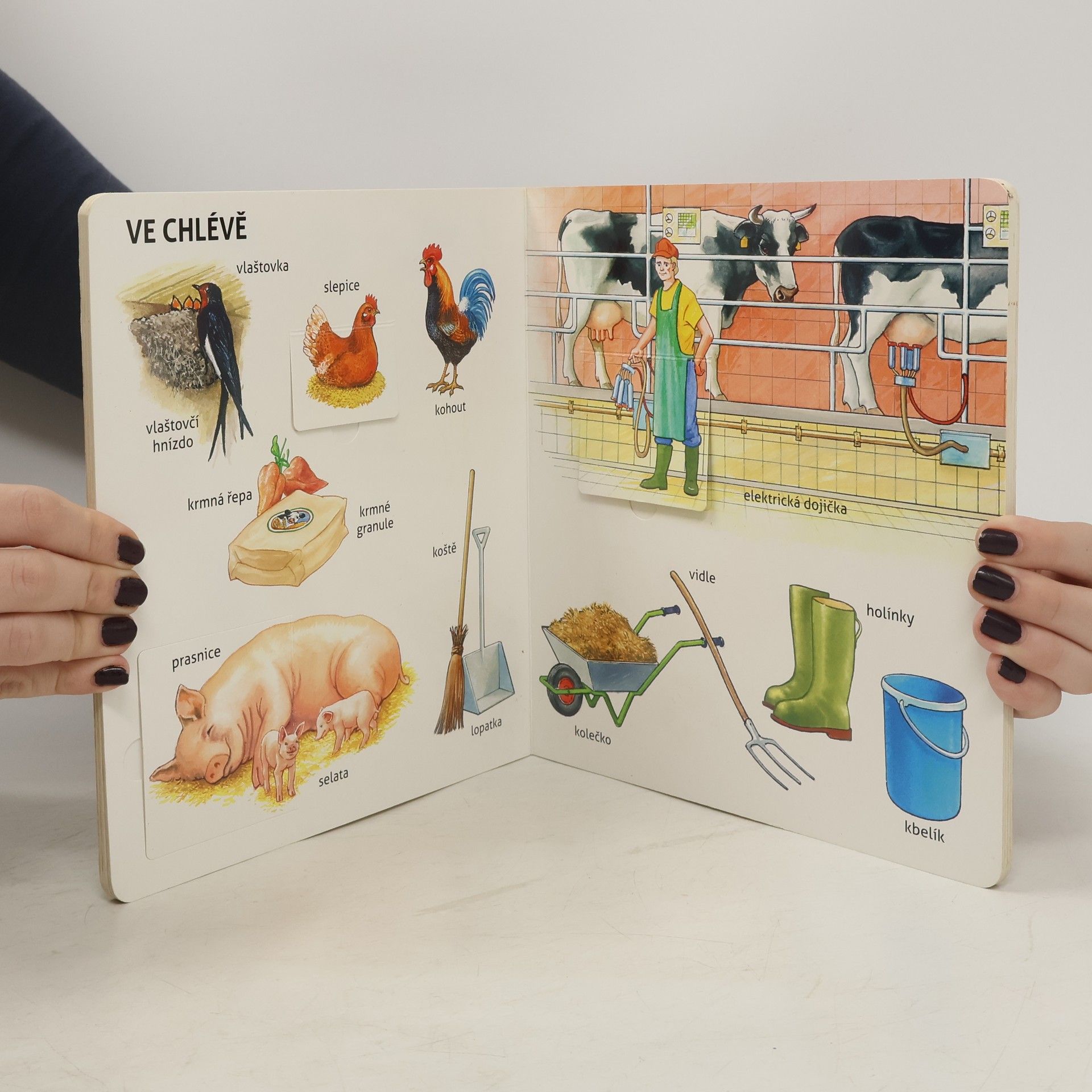 Pojďte s námi na farmu. Dá se tady ledacos objevit. Co roste na poli? Která zvířata žijí na farmě? Co se prodává ve farmářském obchodě? Odpovědi na tyto otázky najdete v této knížce. Překvapivé proměny obrázků a realistické ilustrace vybízejí k objevování a pojmenovávání a tím podporují u dětí rozvoj řeči. Obrázkový slovník, bez kterého se žádný malý obdivovatel farmy neobejde.