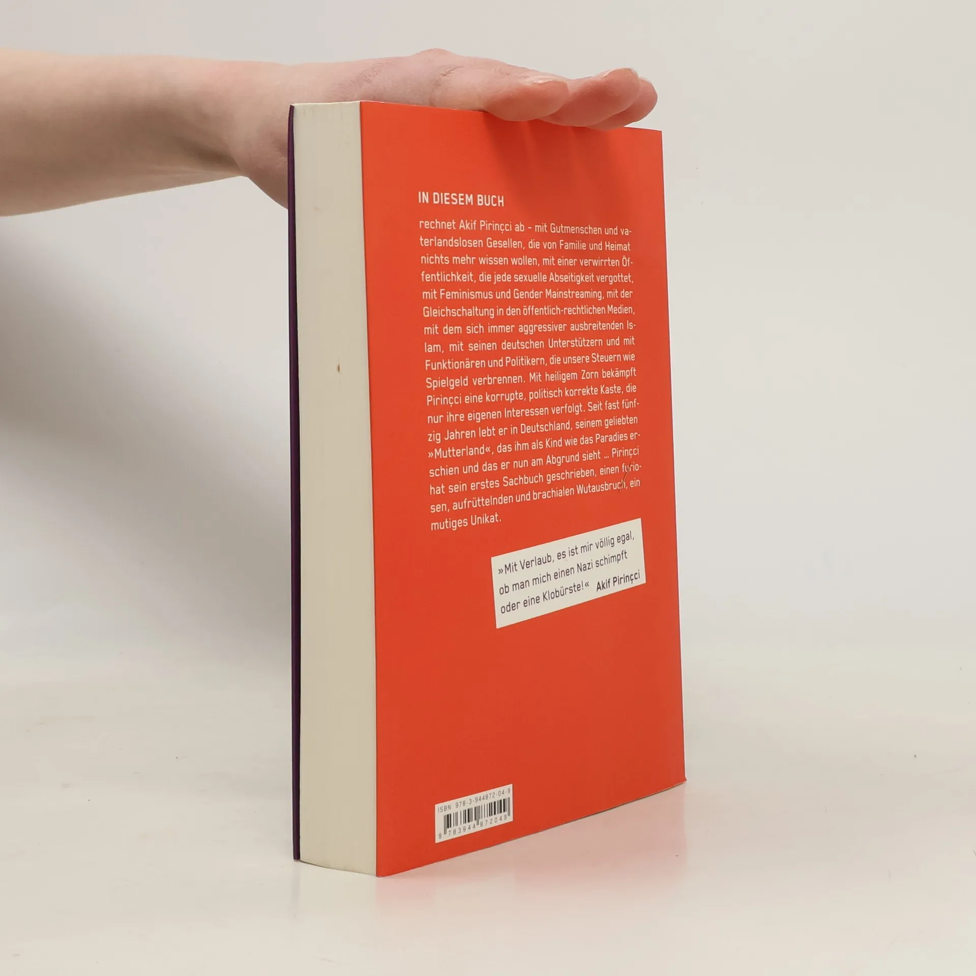 Deutschland, deine Feinde. Muß sich Deutschland noch vor Feinden fürchten, wenn nicht einmal die Deutschen seine Freunde sind? Akif Pirinçci rechnet ab mit Gutmenschen und vaterlandslosen Gesellen, die von Familie und Heimat nichts wissen wollen, mit einer verwirrten Öffentlichkeit, die jede sexuelle Abseitigkeit vergottet, mit Feminismus und Gender Mainstreaming, mit dem sich immer aggressiver ausbreitenden Islam und seinen deutschen Unterstützern, mit Funktionären und Politikern, die unsere Steuern wie Spielgeld verbrennen. Der in Istanbul geborene Bestsellerautor hat sein erstes Sachbuch geschrieben, einen furiosen, aufrüttelnden und brachialen Wutausbruch. Mit heiligem Zorn bekämpft er eine korrupte, politisch korrekte Kaste, die nur ihre eigenen Interessen verfolgt. „Deutschland von Sinnen“ ist geschmiedet aus reinem Zorn, ein mutiges Unikat, das seinesgleichen sucht. Es ist der Aufschrei eines Rufers in der Wüste, der sein geliebtes Mutterland am Abgrund sieht. Vielleicht ist es das letzte Buch seiner Art, denn das meinungspolitische Zwangskorsett wird täglich enger.